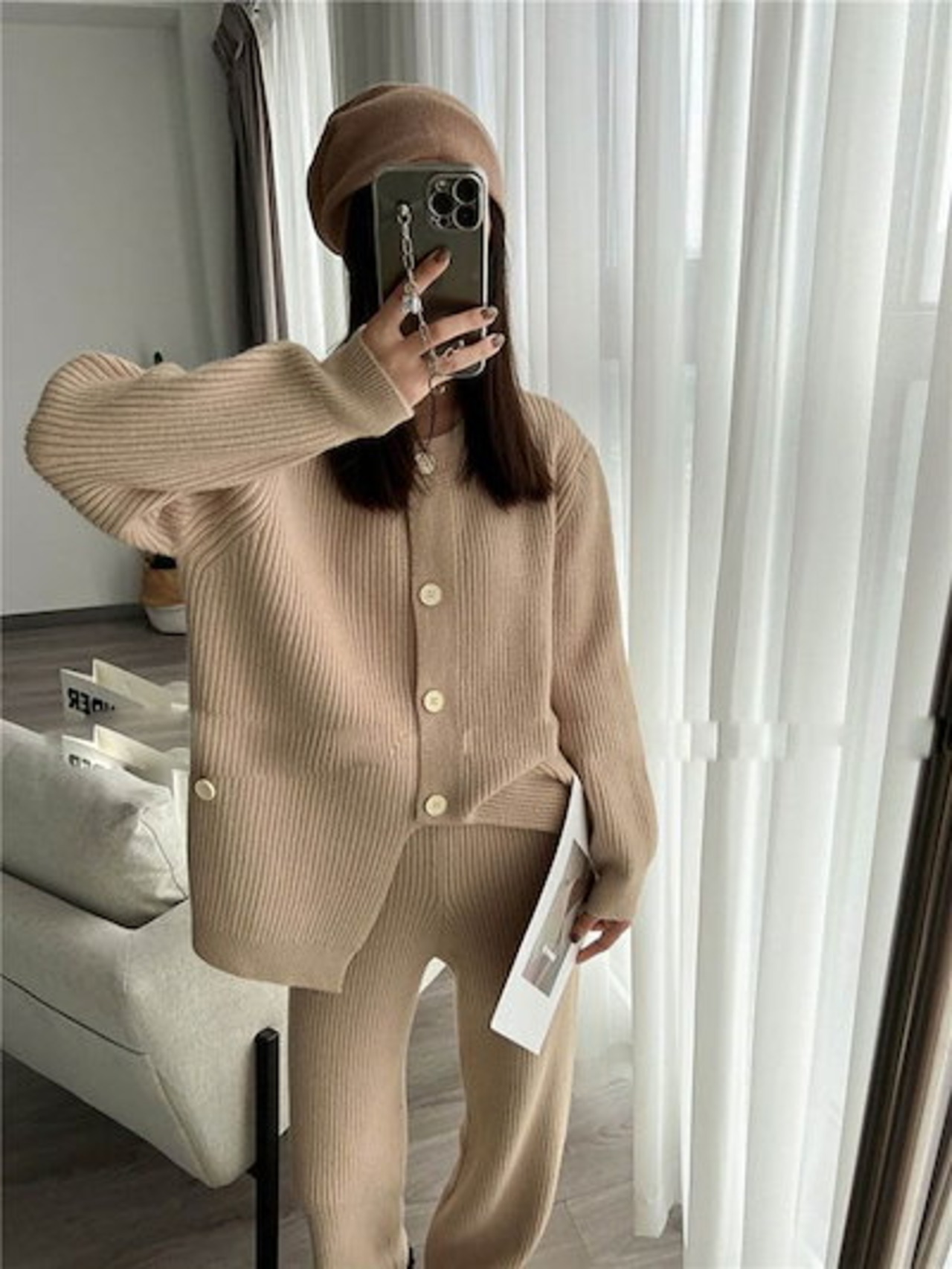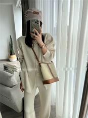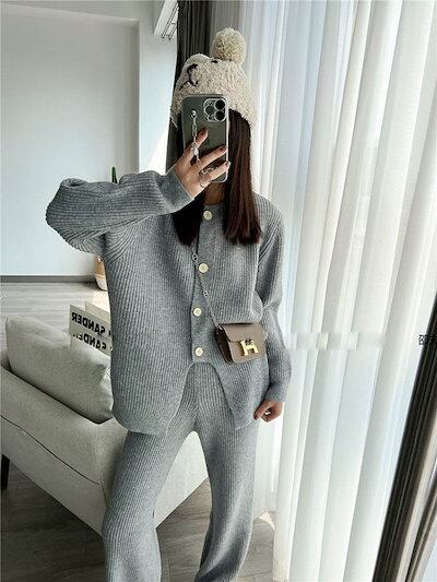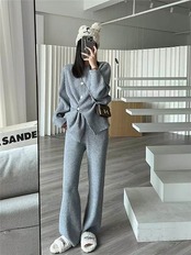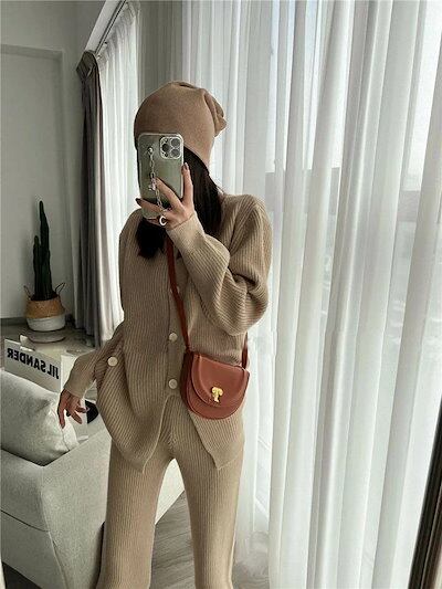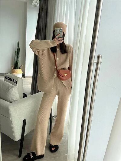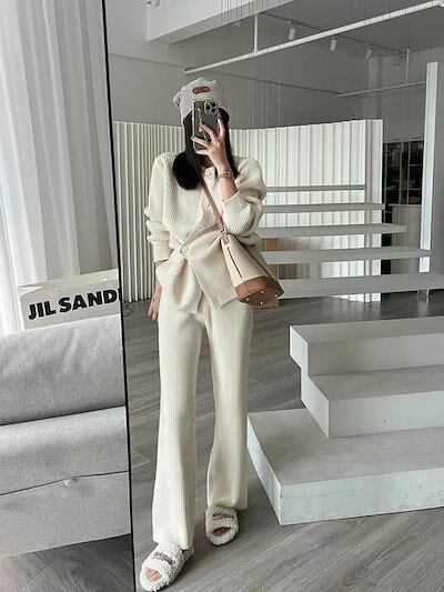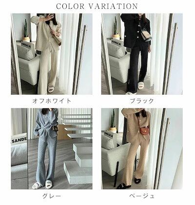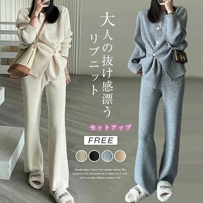 ニットセットアップ レディース 秋冬 リブ ニットセット 無地 上下セット 前開き 2点セット ワイドパンツ クルーネック プルオーバー 上下 ニット ロングパンツ 長袖 カーディガン カジュアル