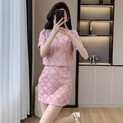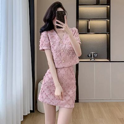 上下セット 高級感 夏服 ピンク スカートレディース レース 新作 涼しく楽ちんセットアップ