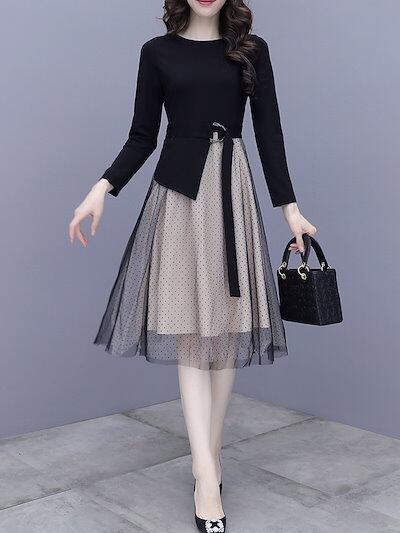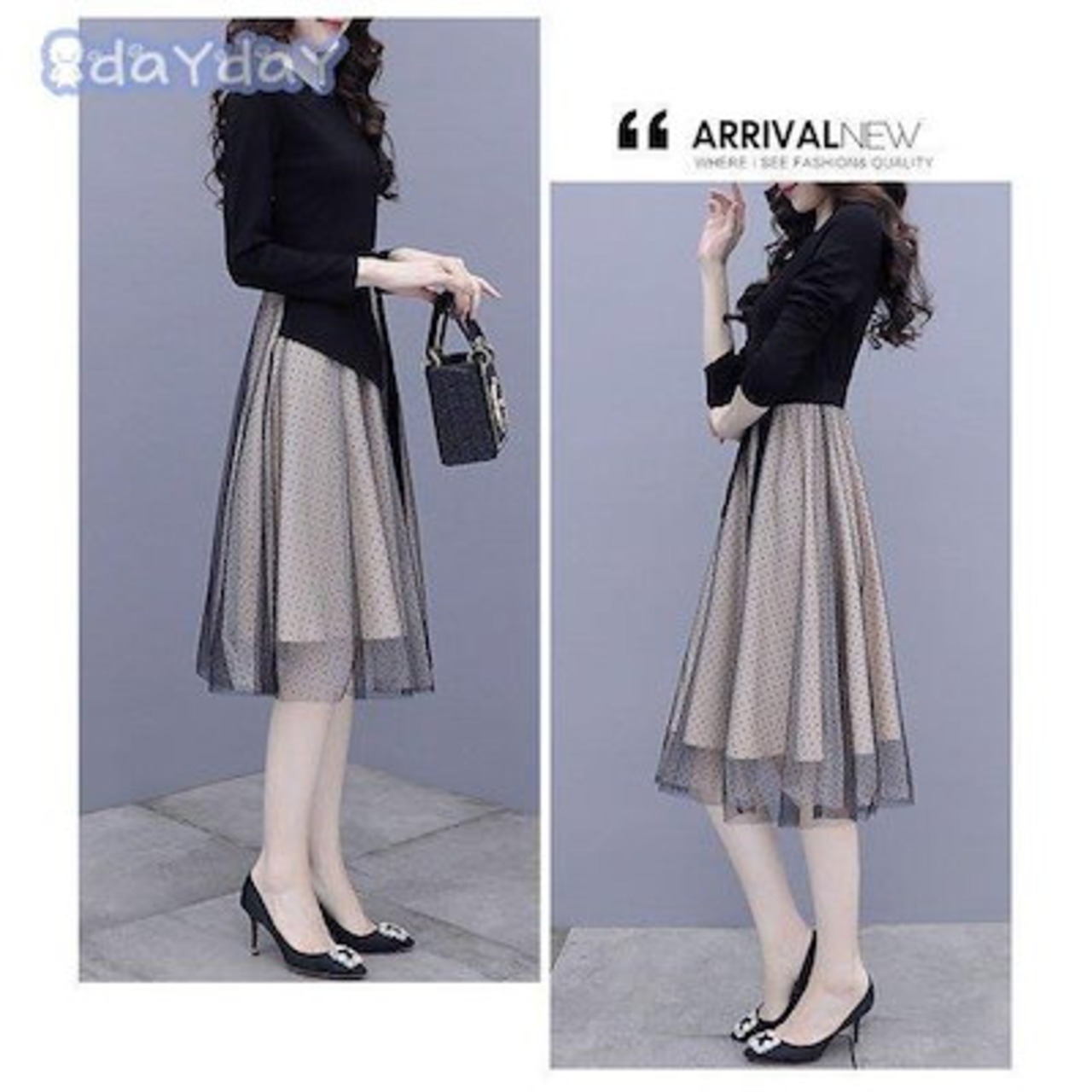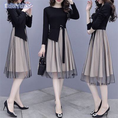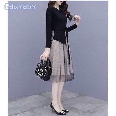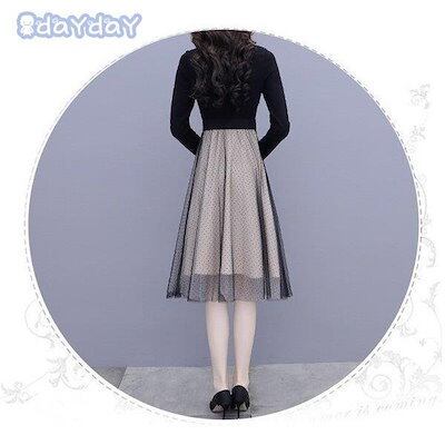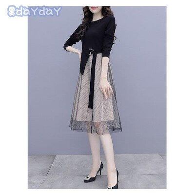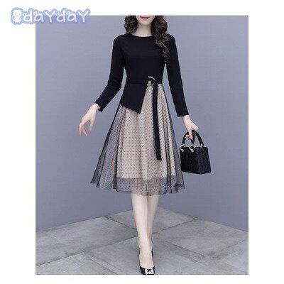 ひざ丈ワンピース レディース Aライン ワンピ チュールスカート 長袖 膝丈 着痩せ 秋 冬 フォー