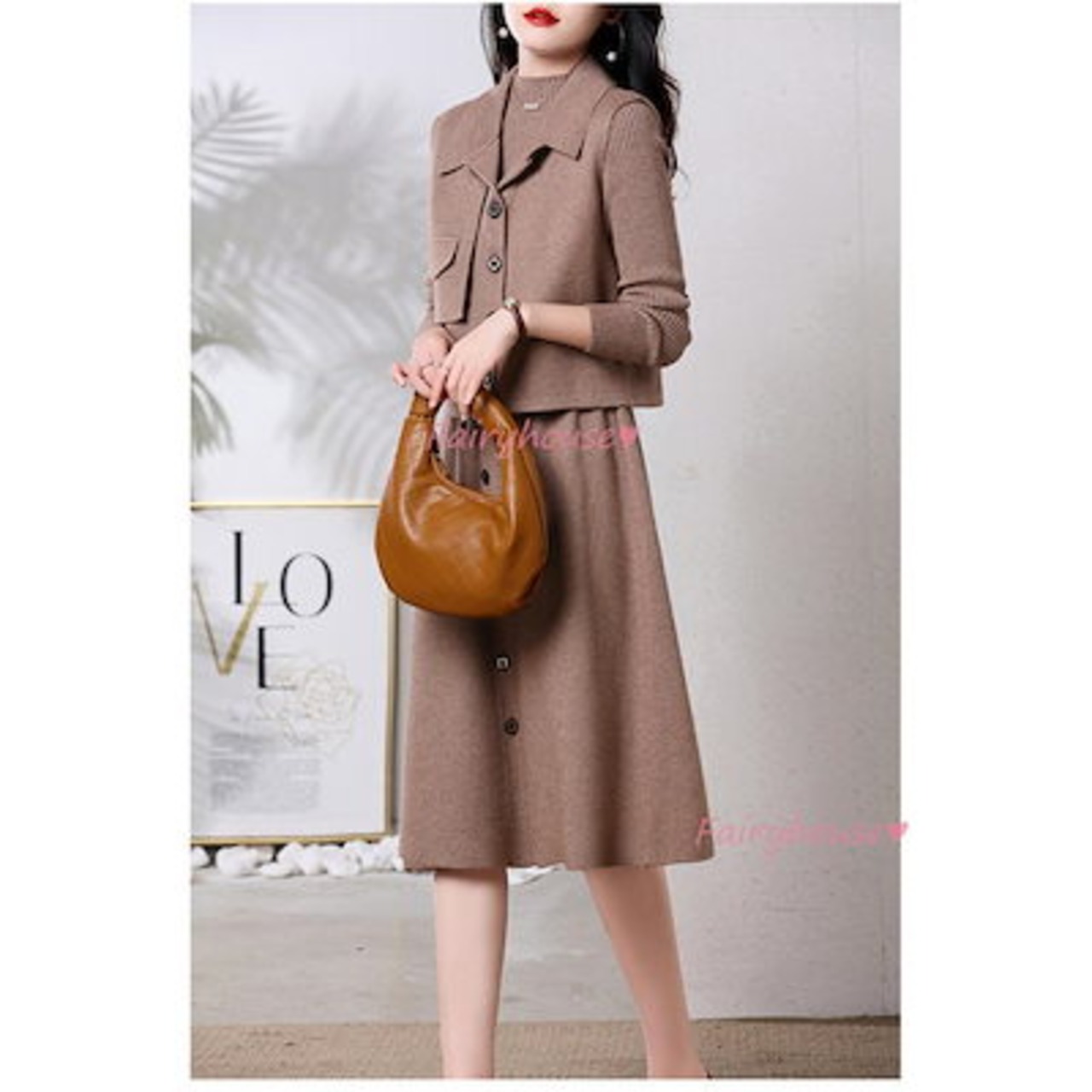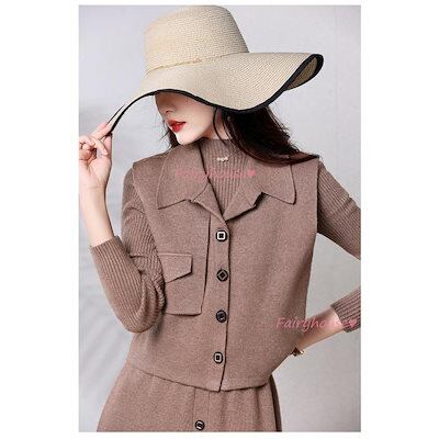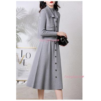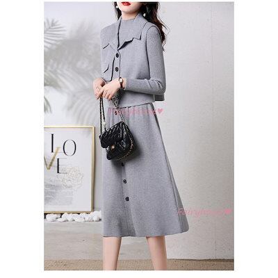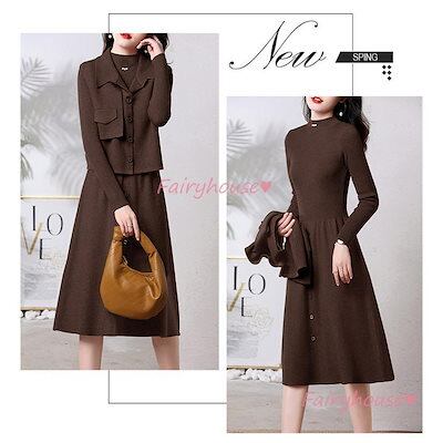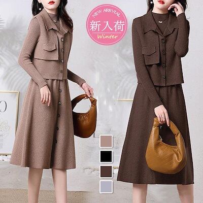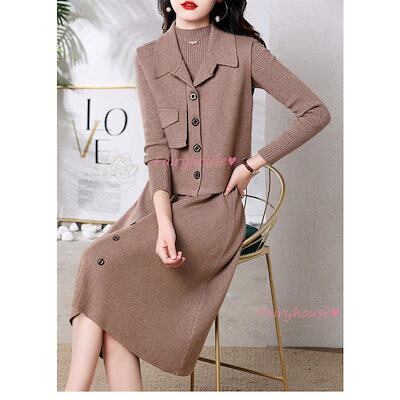 超目玉新品 ニットワンピースセットアップ レディース 秋冬 ニット2点セット 長袖ワンピース 無地ニットベスト Aラインスカートニットセットアップ 韓国風 ゆったり 50代