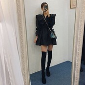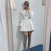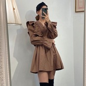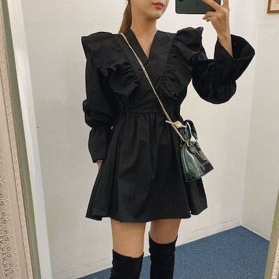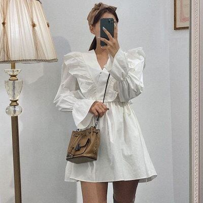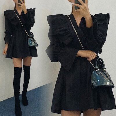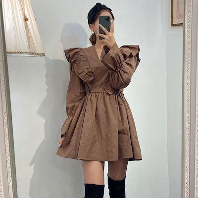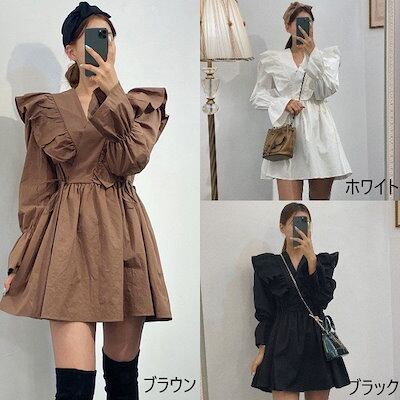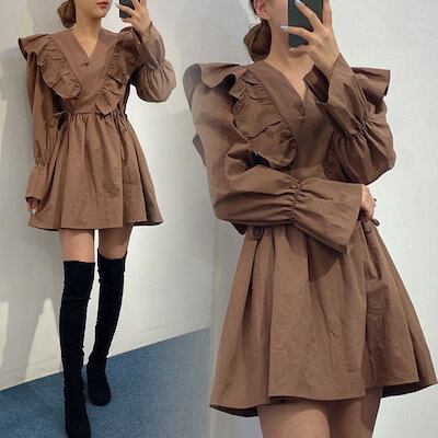 ワンピース レディース Vネック 長袖 無地 フリル ミニ丈 大きいサイズ フレア Aライン 着痩せ