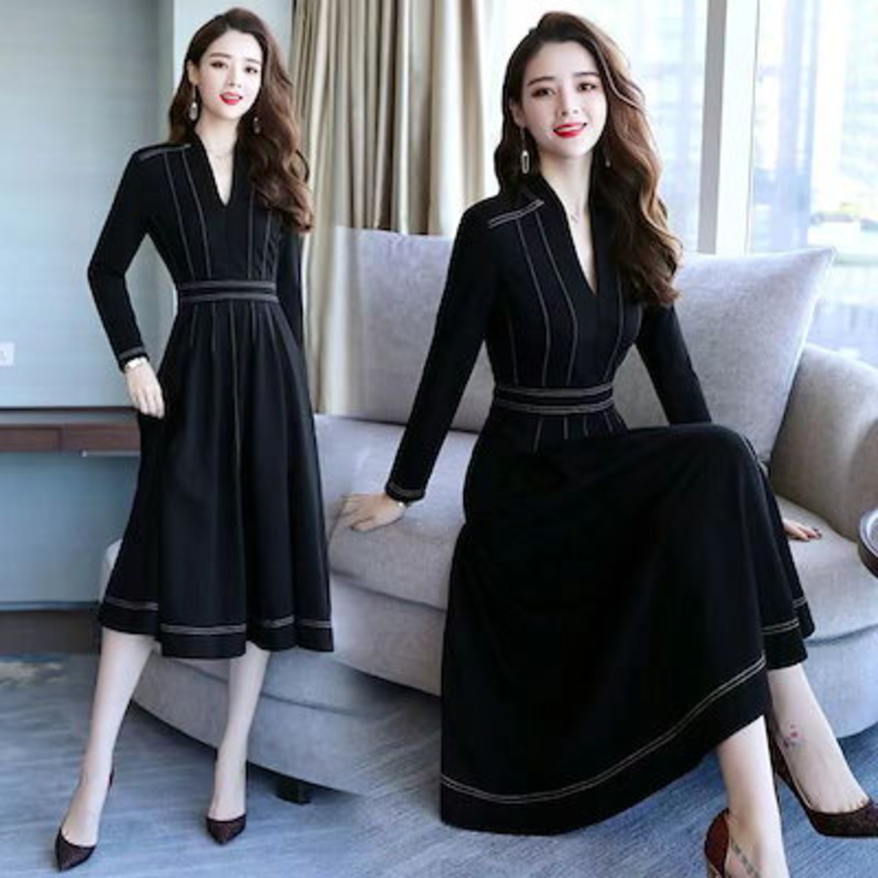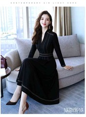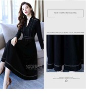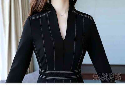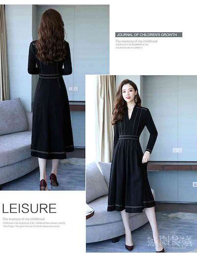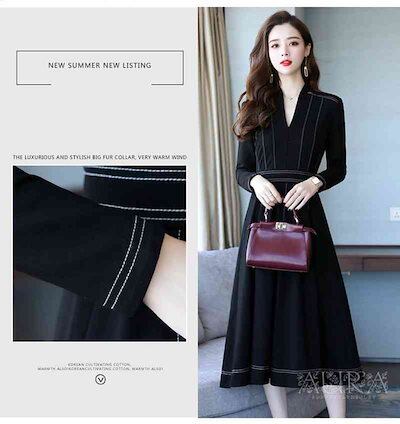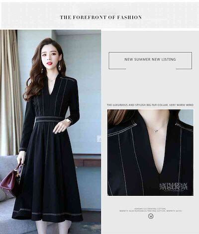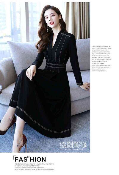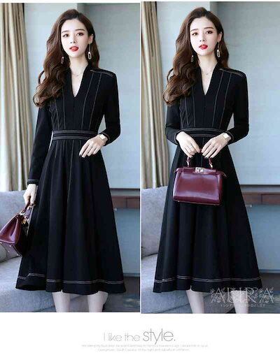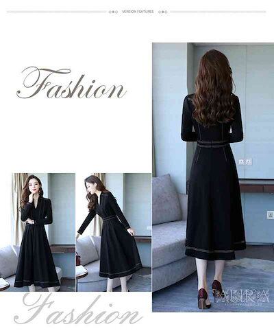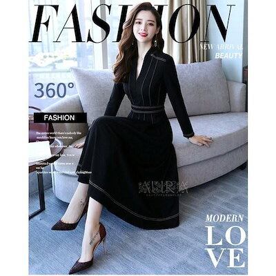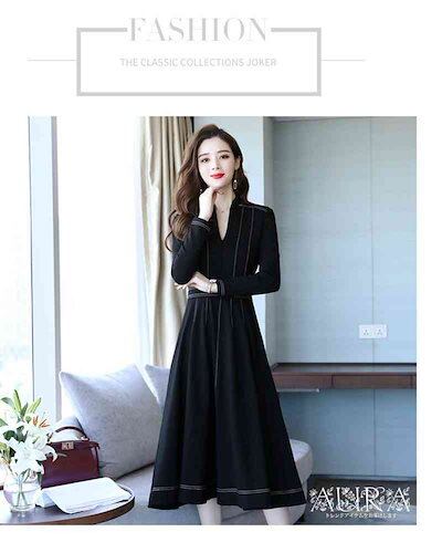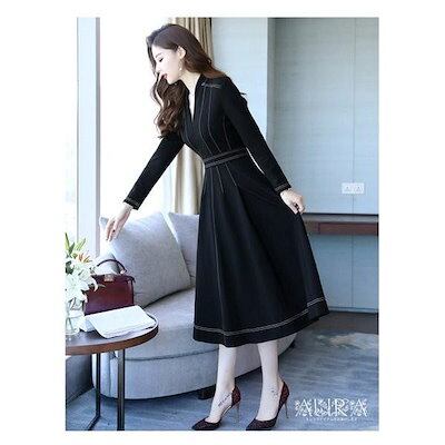 ワンピース ワンピース 長袖 無地 Aライン キレイめ レディース 上品 春秋 Vネック 膝丈ワンピース 大人 通勤