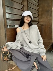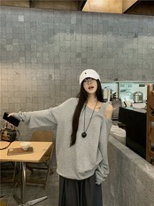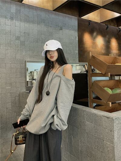 2024 秋冬 トップス 長袖 かわいいラウンドネック Tシャツ 肌見せ レディース 韓国風 ルーズ ゆったり 無地 カジュアル おしゃれサイズ シルエットファッション系コーデ衣装お出かけ