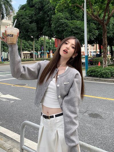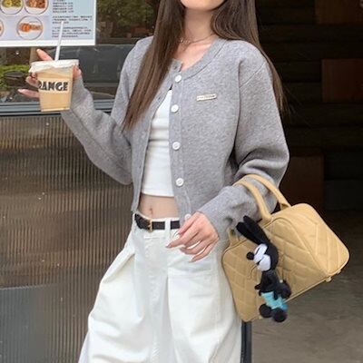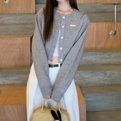 2024 秋冬トップス カーディガン ニット セーター ラウンドネック ボタン 長袖 丈短め 細見え 秋 グレー おしゃれ かわいい 韓国ファッション レディース お出かけ
