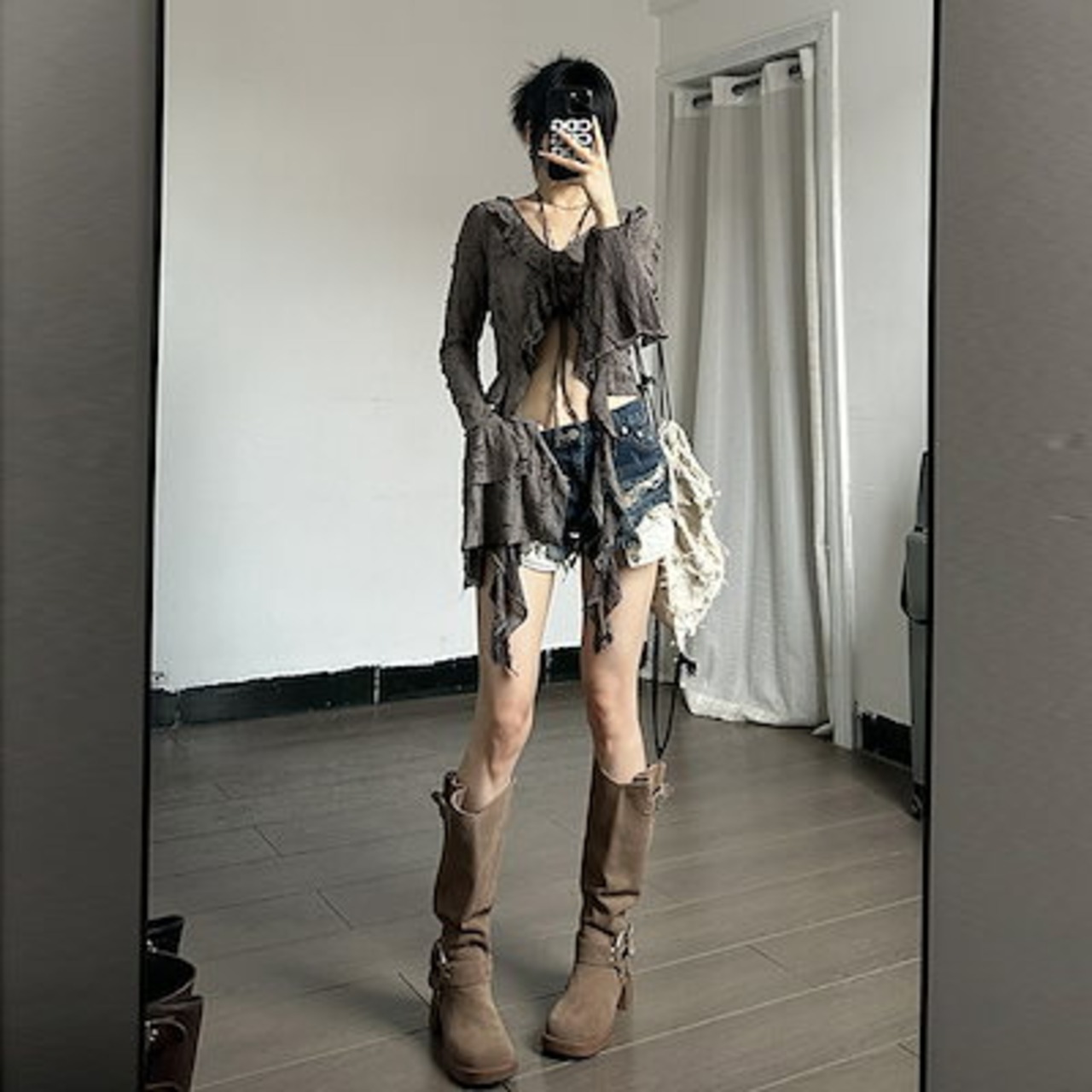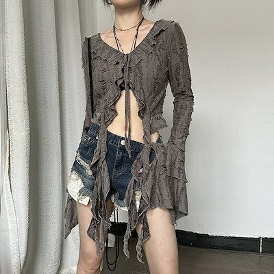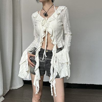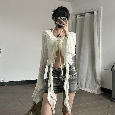 2024 夏秋 韓国 ショート丈 変形 カーディガンブラウストップスレディース長袖へそ出し UVカット 羽織り きれいめライトニットOLネックカジュアルフレンチフェミニンファッションフィッシュ系