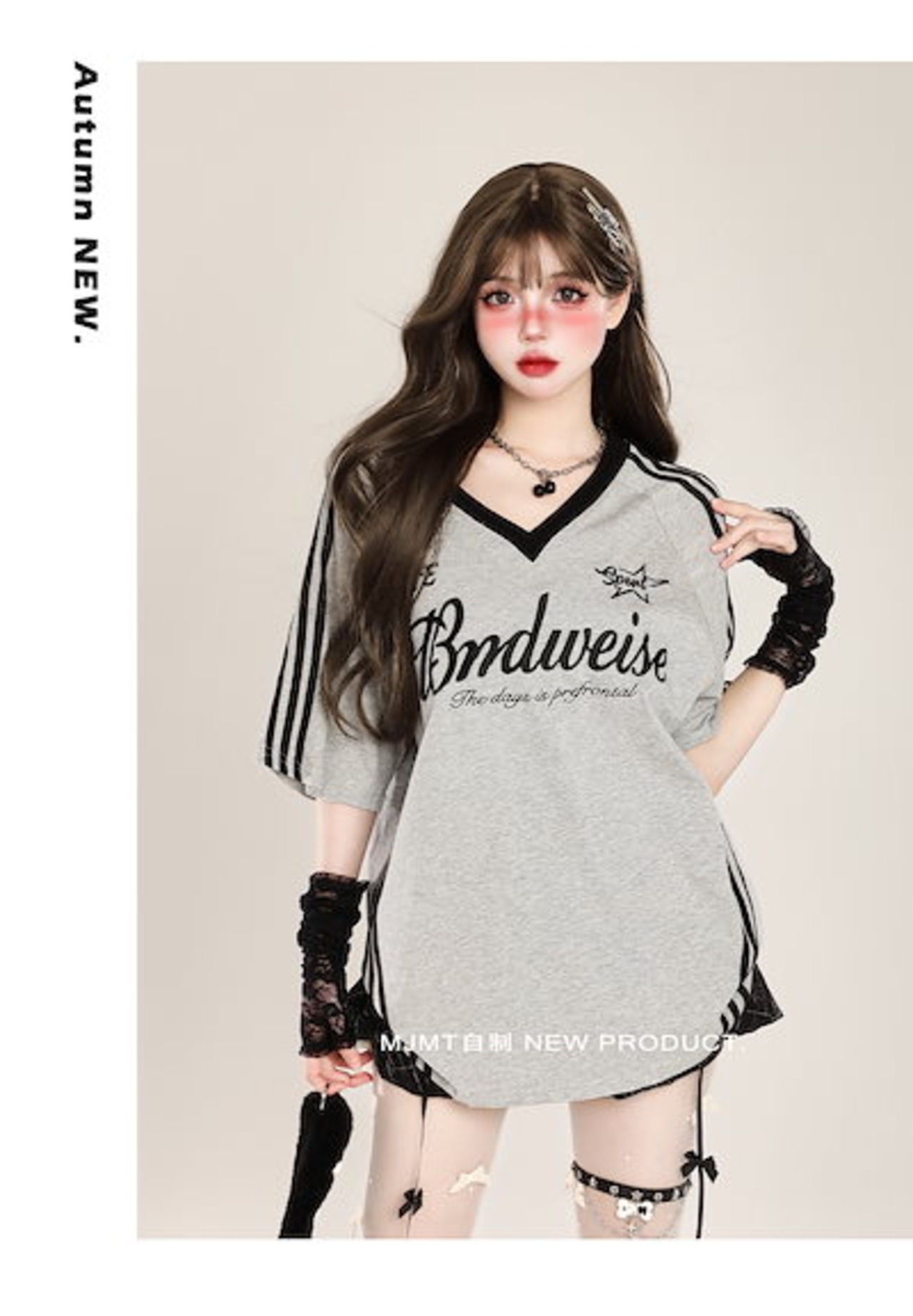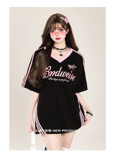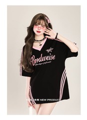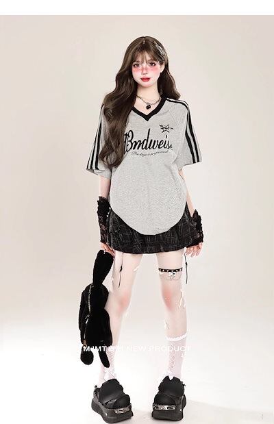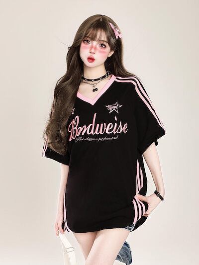 2024夏 韓国可愛い風トップス Tシャツ ファッション系 半袖 スリムフィット サイド ペイントシルエット ゆったり丈 休日レディースサイズ韓国Vネック おしゃれ カジュアル メンズライク T