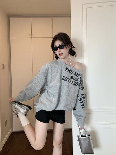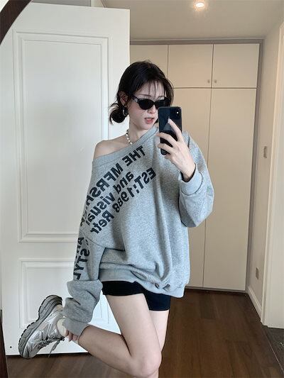 2024夏トップス スウェット 長袖 肩見せ 英語 プリント ゆったり 細見え 夏 グレー おしゃれ かわいい 韓国ファッション レディース お出かけ
