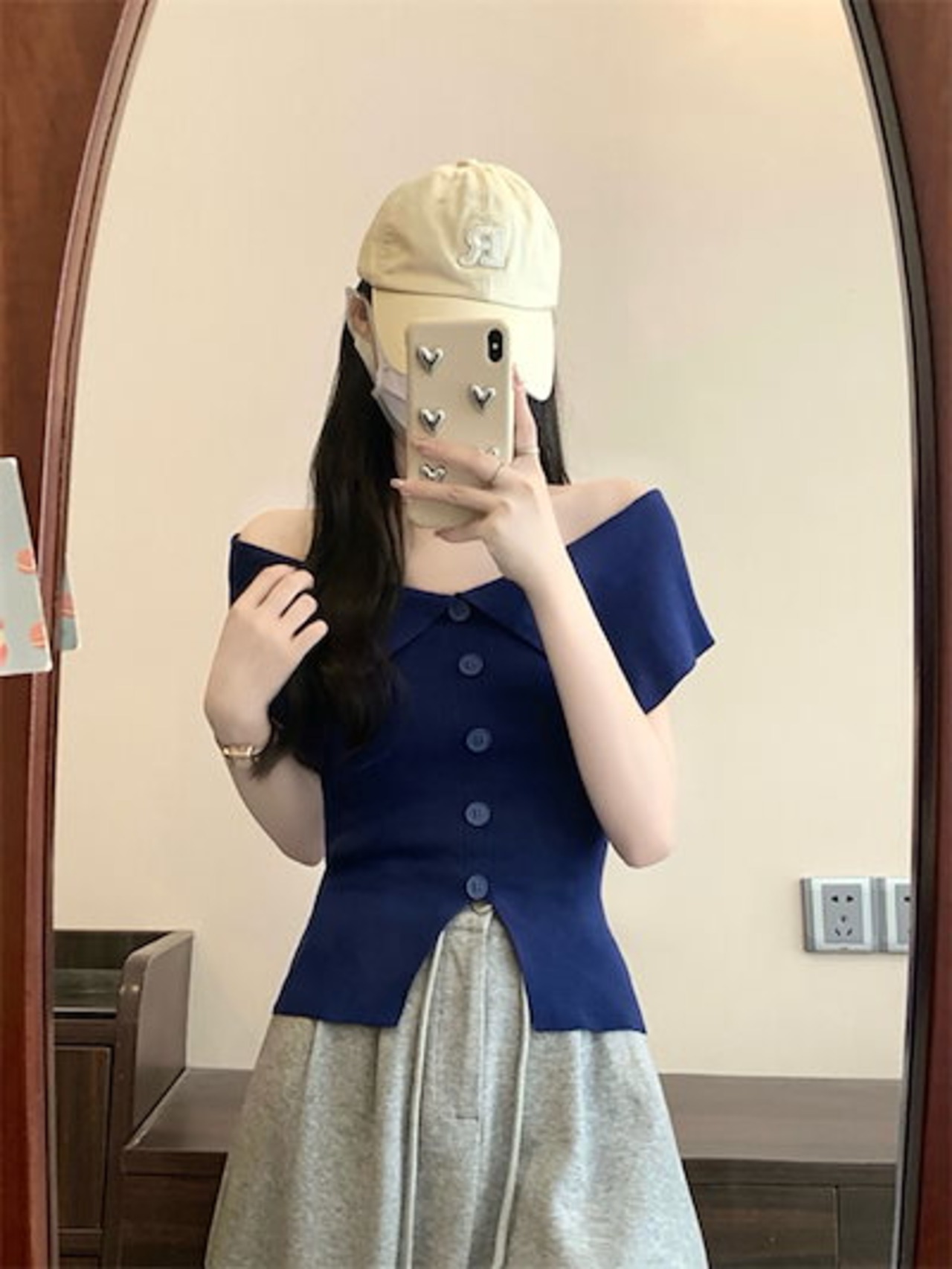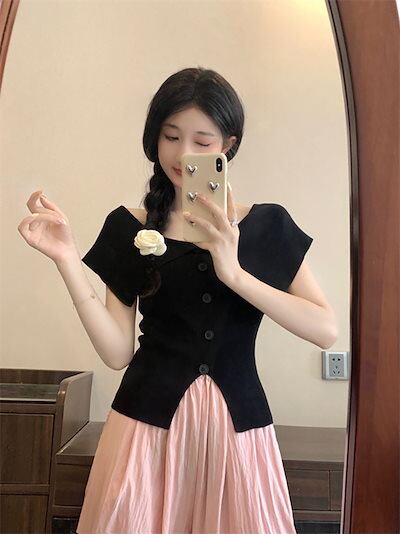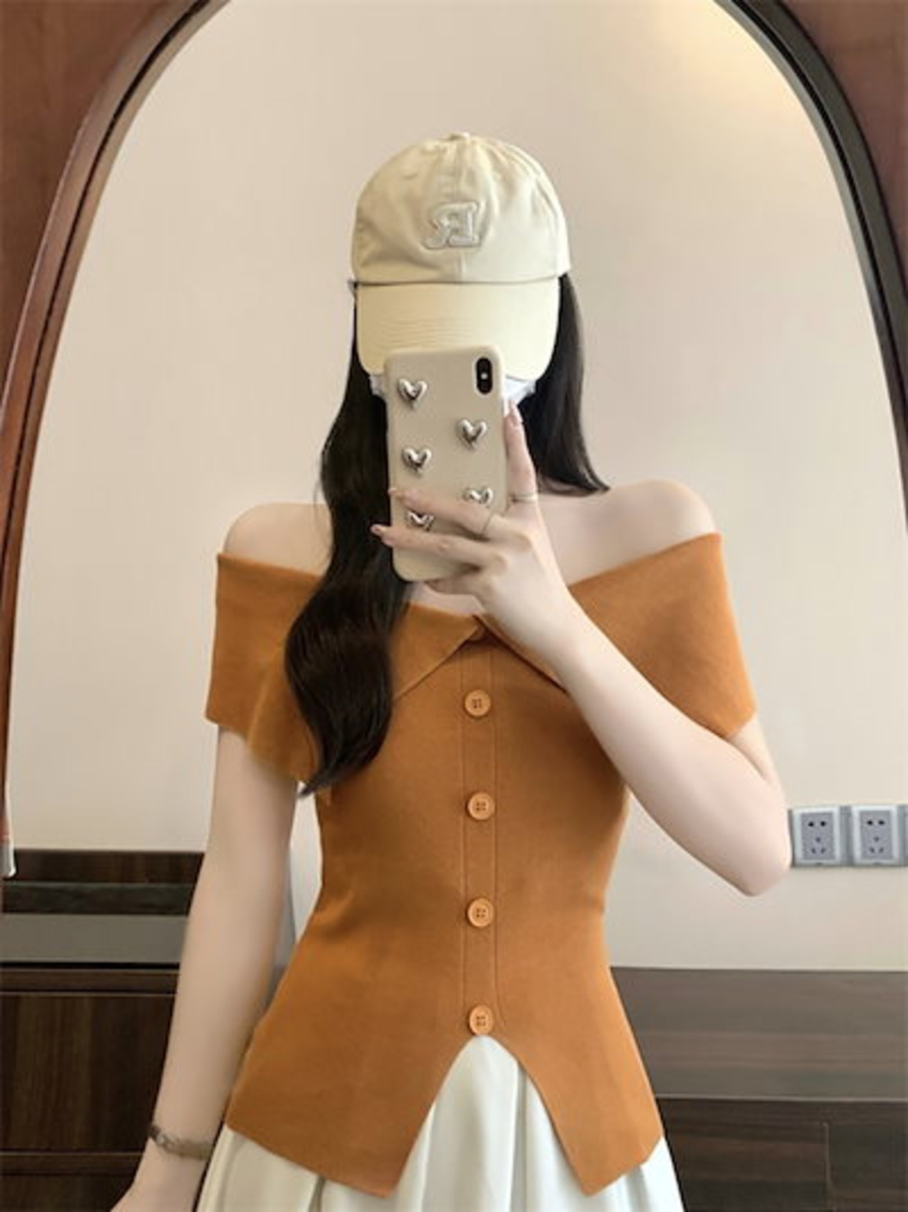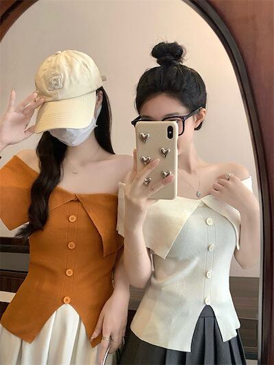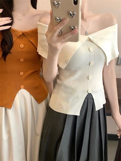 2024夏トップス シャツ 半袖 オフショルダー ボタン スリム 細見え 夏 白 オレンジ 黒 おしゃれ かわいい 韓国ファッション レディース お出かけ