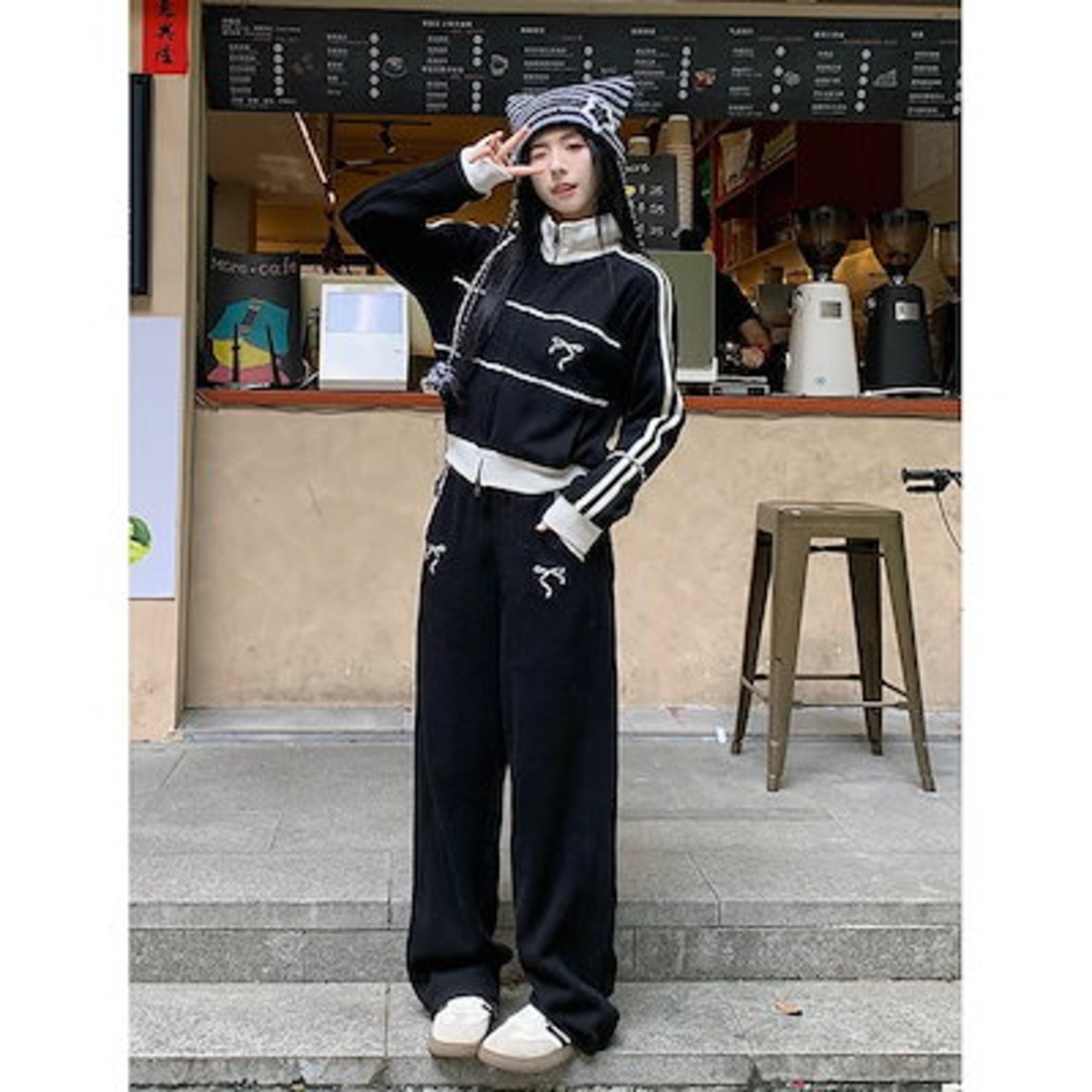2024 秋 上下2点セット トップス お出かけ韓国 羽織り ショート丈フルラウンドヘムサイズ丈ボトムス ストレート系冬 ゆったりレディースシルエット スタイルアップワイドお出かけトラック