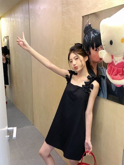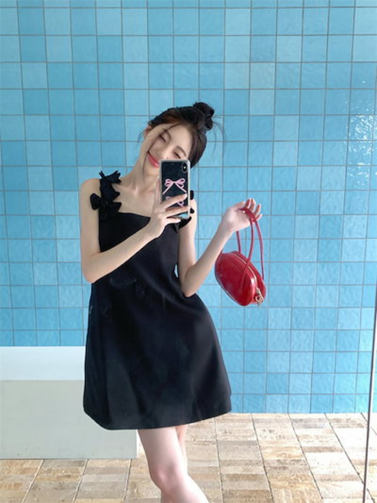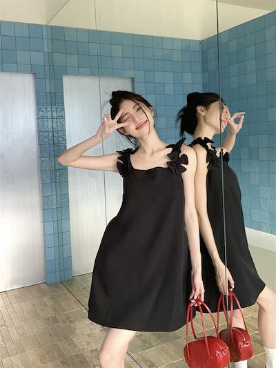 2024春夏ワンピース ミニ丈 スクエアネック ノースリーブ Aライン ゆったり 細見え 夏 おしゃれ かわいい ガーリー キュート 甘め 黒 ブラック 韓国ファッション レディース お出かけ