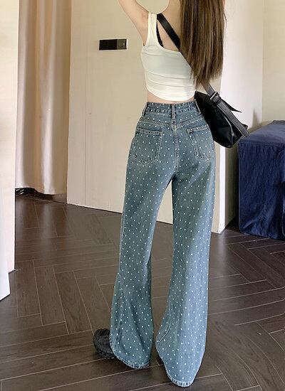 2024春夏パンツ デニム ジーンズ ドット柄 ワイド ストレート ハイウエスト 脚長効果 美脚効果 細見え 春 カジュアル おしゃれ かわいい 韓国ファッション レディース お出かけ