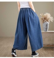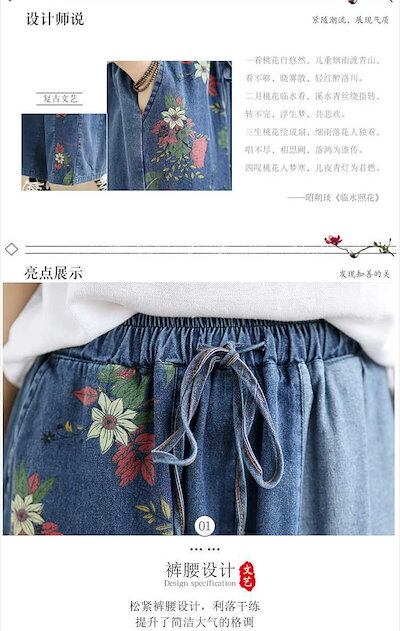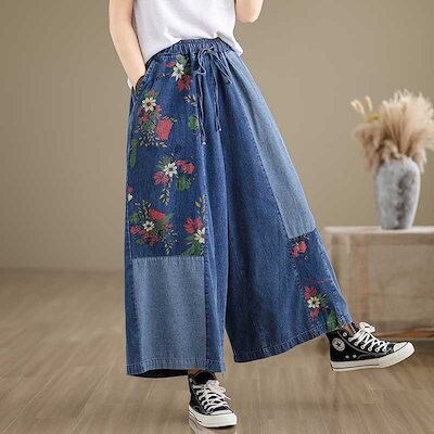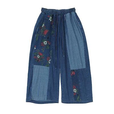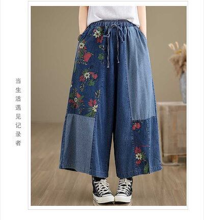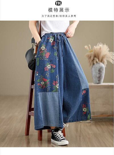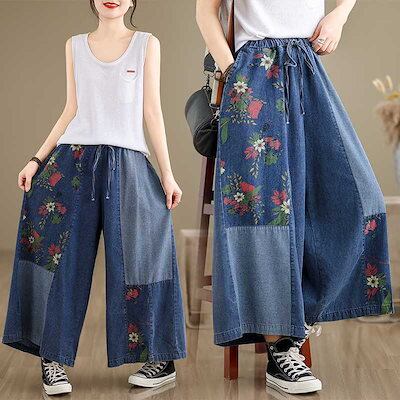 「ファットガール」 夏 デニム ワイドパンツ 刺繍 レトロ 薄手 ドッキング ワイドパンツ 体型カバー 大きいサイズ ゆったり レディース