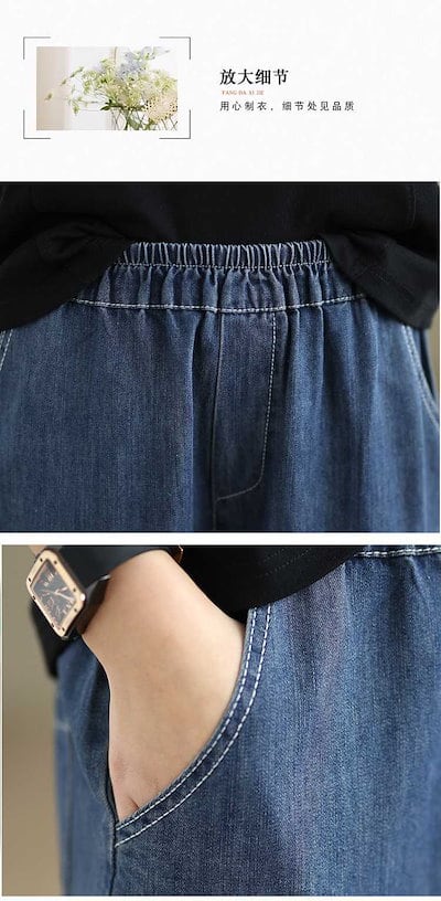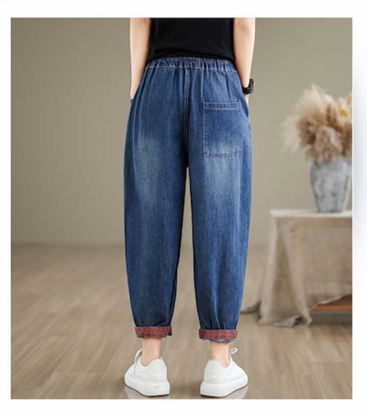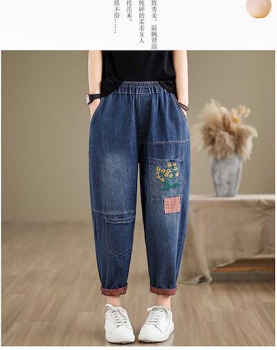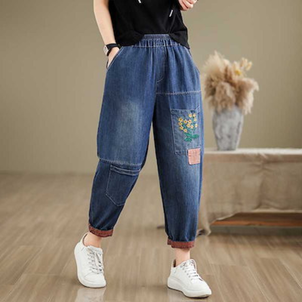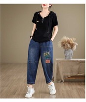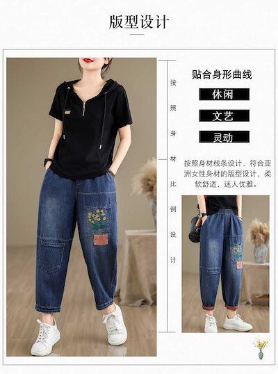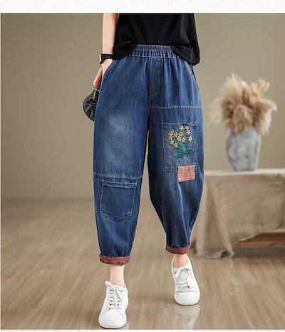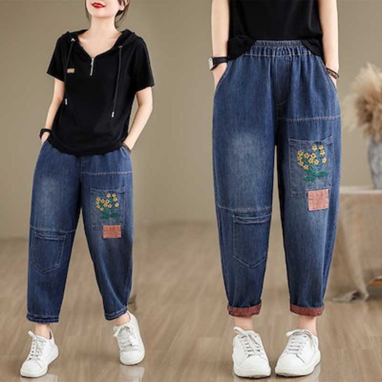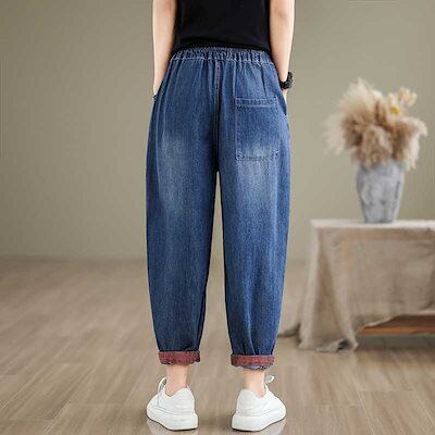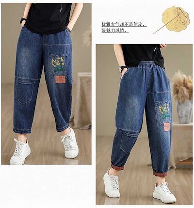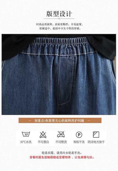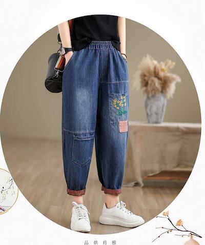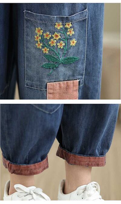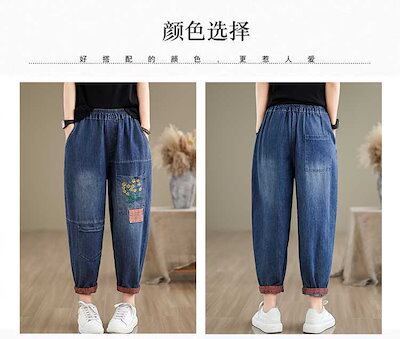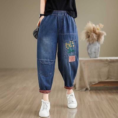 「ファットガール」 夏 刺繍 デニムパンツ ジーンズ ゴム 九分丈 薄手 ワイドパンツ デーパードパンツ 体型カバー 大きいサイズ ゆったり レディース