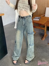 2024 春夏パンツ モップパンツ デニム ジーンズ ワイド ストレート ポケット ハイウエスト 脚長効果 美脚効果 細見え ウォッシュ加工 春 水色 カジュアル 韓国ファッション レディース お出か