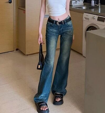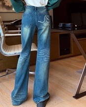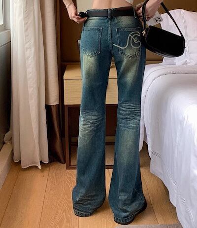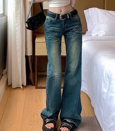 2024春夏 アメリカン パンツ デニム ブルー ジーンズ ロング丈 スキニー レッグ加工 ハイウエスト 脚長効果 美脚効果 細見え 秋 カジュアル 韓国ファッション お出かけ1