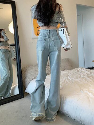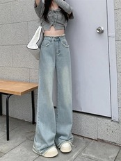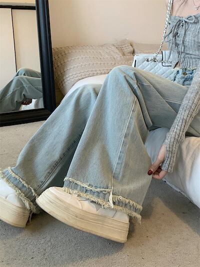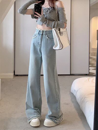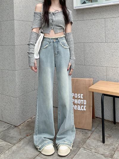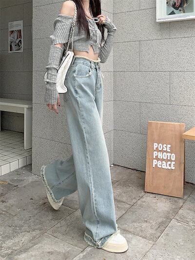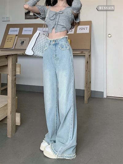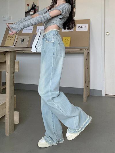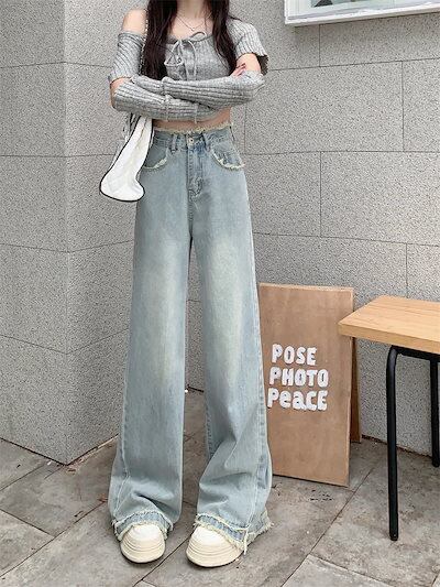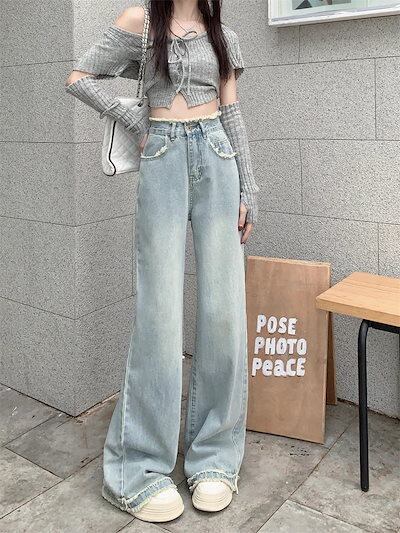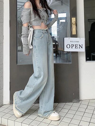 2024 春夏 デニムパンツ ハイウエスト ストレート ボトムス ジーンズ ワイドパンツ カジュアル 韓国ストリート加工