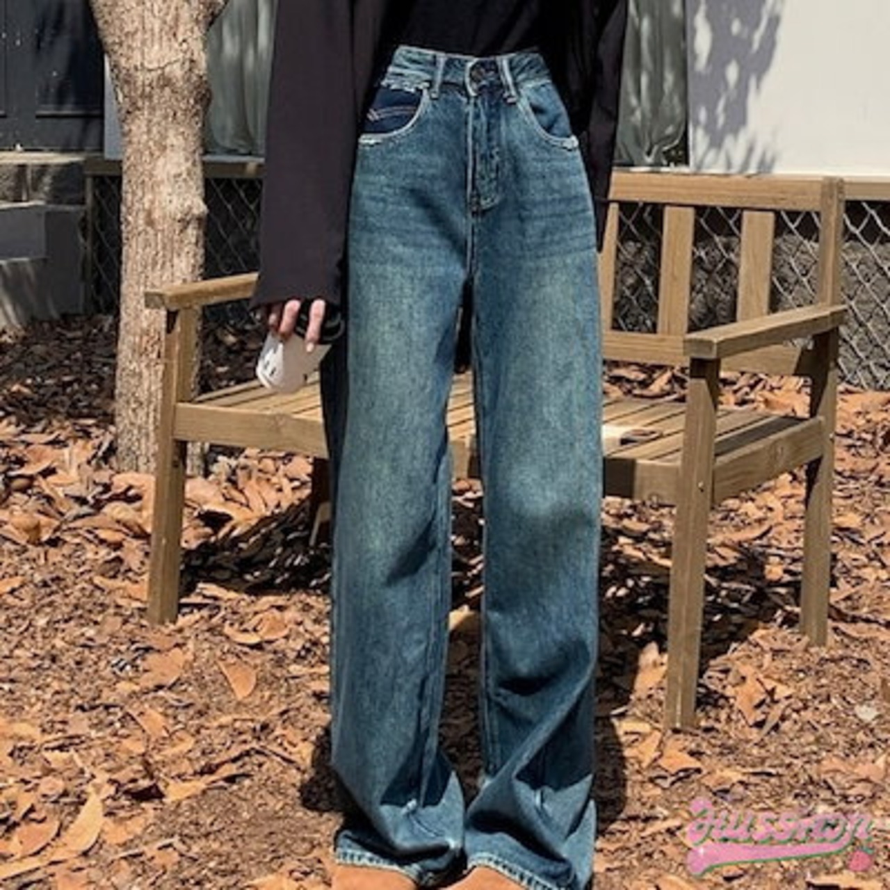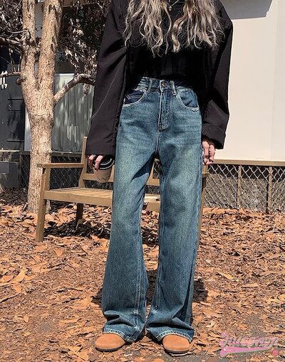 パンツ デニム ジーンズ モップパンツ ステッチ ワイド ストレート ハイウエスト 脚長効果 美脚効果 細見え 春 カジュアル 韓国ファッション レディース お出かけ