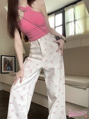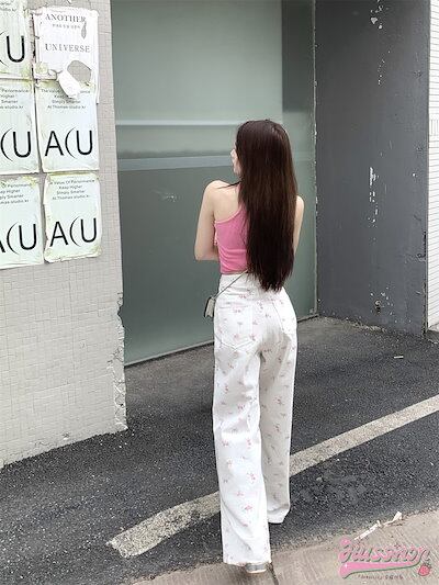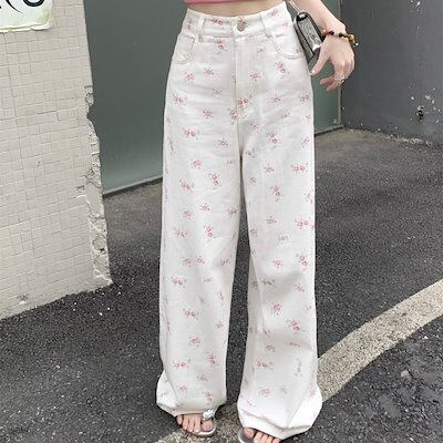 パンツ デニム ジーンズ 花柄 ピンクの花 ワイド ストレート ハイウエスト 脚長効果 美脚効果 細見え 春 白 ホワイト カジュアル 韓国ファッション レディース お出かけ