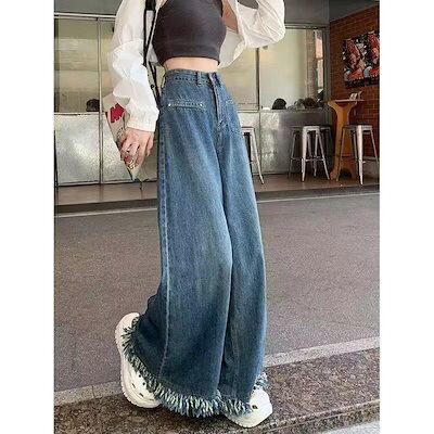 ハイウエスト フリル ワイド デニム レディース 秋の新作スリムフリンジ ストレートロングパンツ