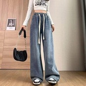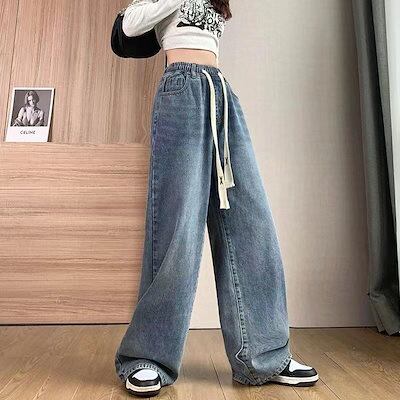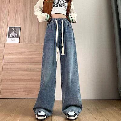 ハイウエスト小柄フロアレングスワイドレッグパンツ2024 ルーズスリミング弾性ウエストストレートレッグジーンズ女性用