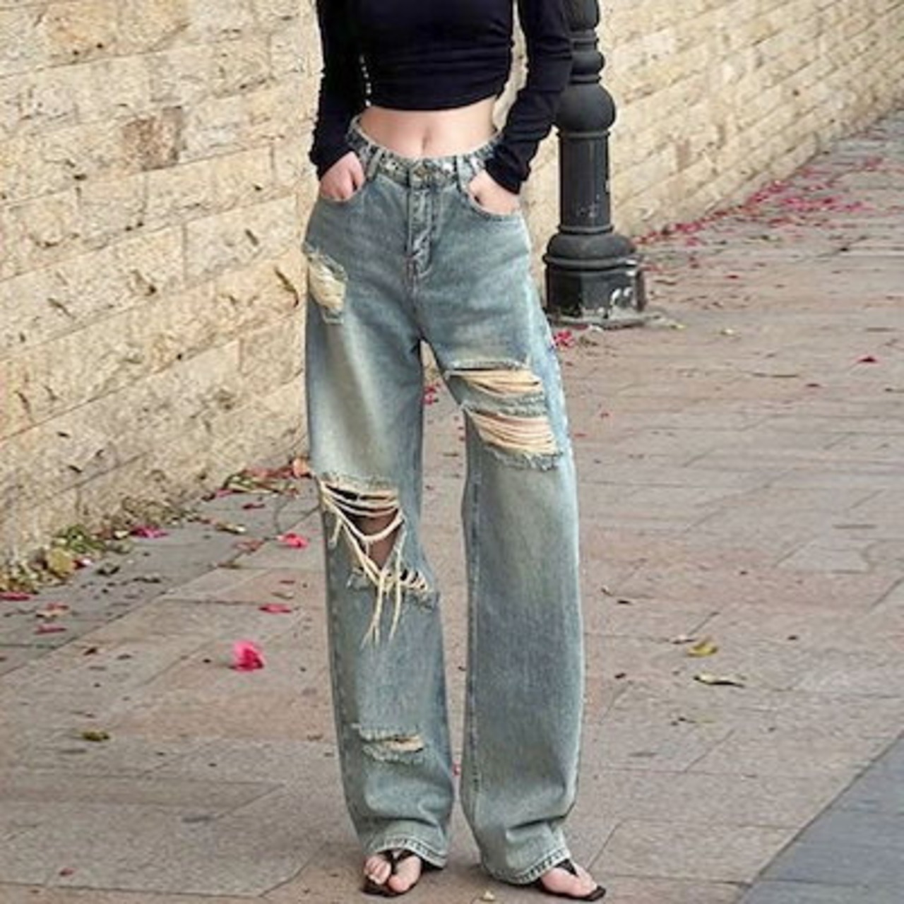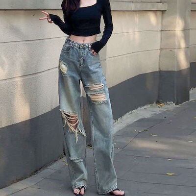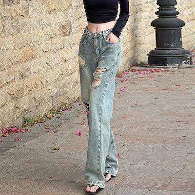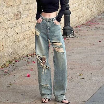 ワイドパンツ??ダメージジーンズ デニムパンツ ストレート モップパンツ ストレート 着痩せ ズボンオールマッチ レディーススラックスパンツ