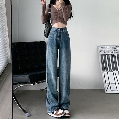 韓国版ドレープ感覚のワイドジーンズ レディース秋冬新作ハイウエストルーズストレート細身ビッグヤードドラッグロングパンツ