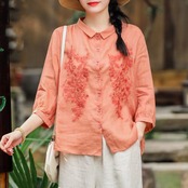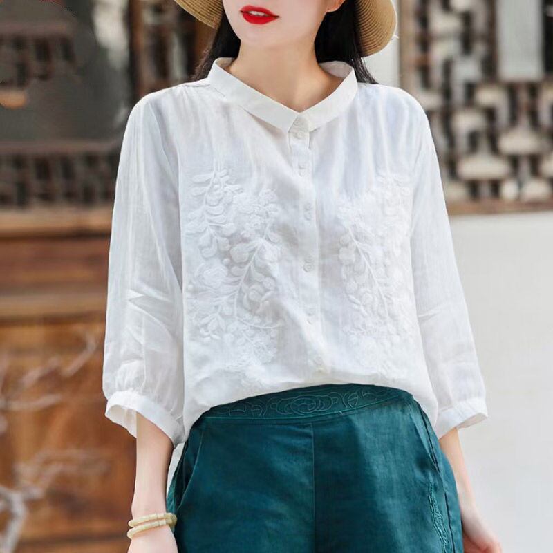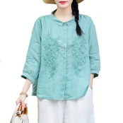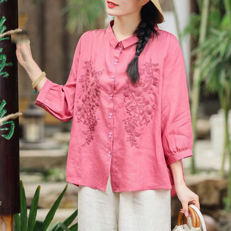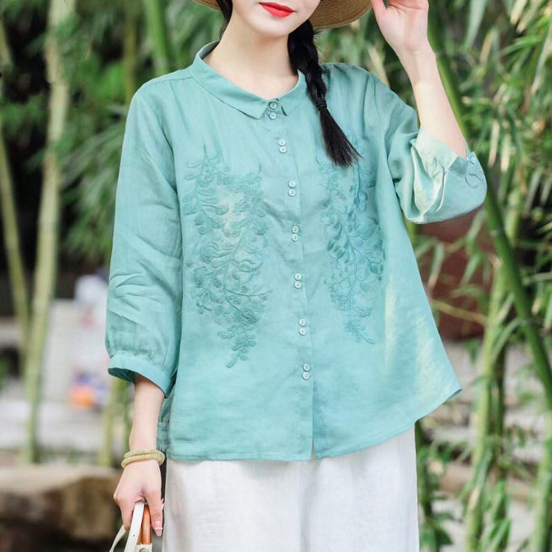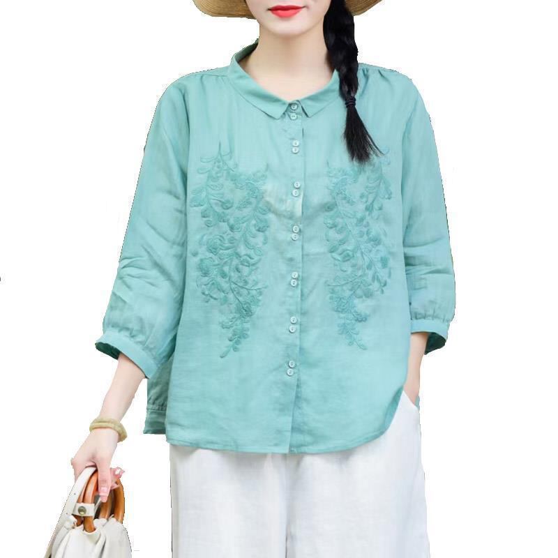 初回送料無料刺?シャツトップコットンリネンシャツ刺?レディースファショントップス