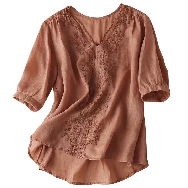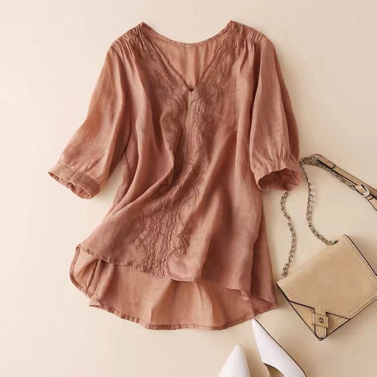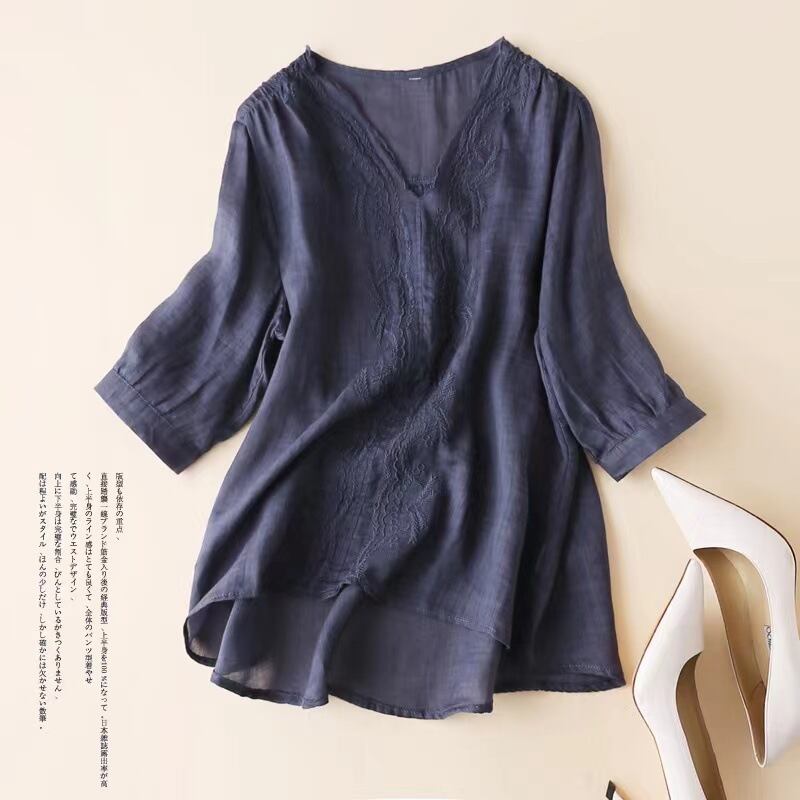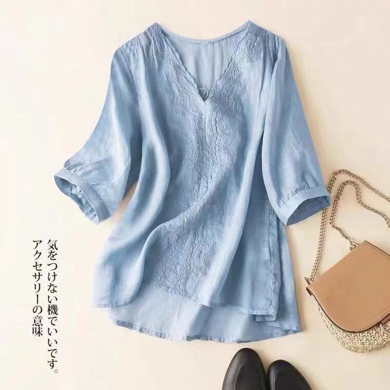 初回送料無料刺?シャツゆったりサイズVネックトップコットンリネンTシャツプトップス