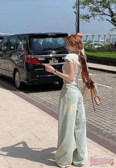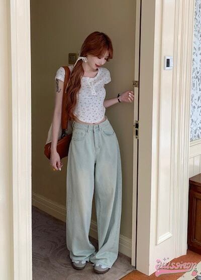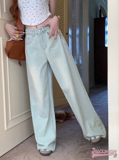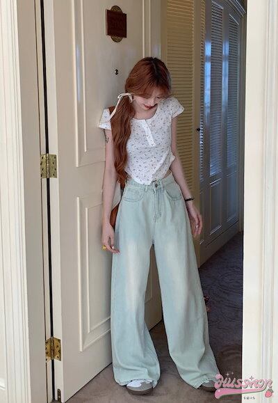 2024春夏パンツ モップパンツ デニム ジーンズ ワイド ストレート ハイウエスト 脚長効果 美脚効果 細見え ウォッシュ加工 春 水色 カジュアル 韓国ファッション レディース お出かけ