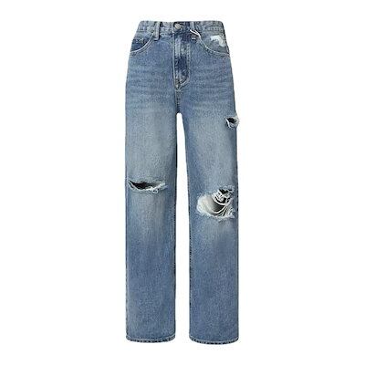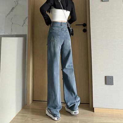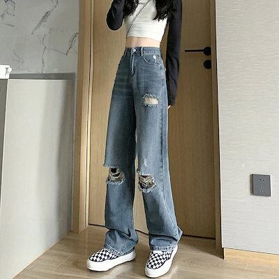2024新作 ダメージジーンズ レディース 春夏 ハイウェスト ストレートパンツ ゆったり ワイドパンツ モップパンツ