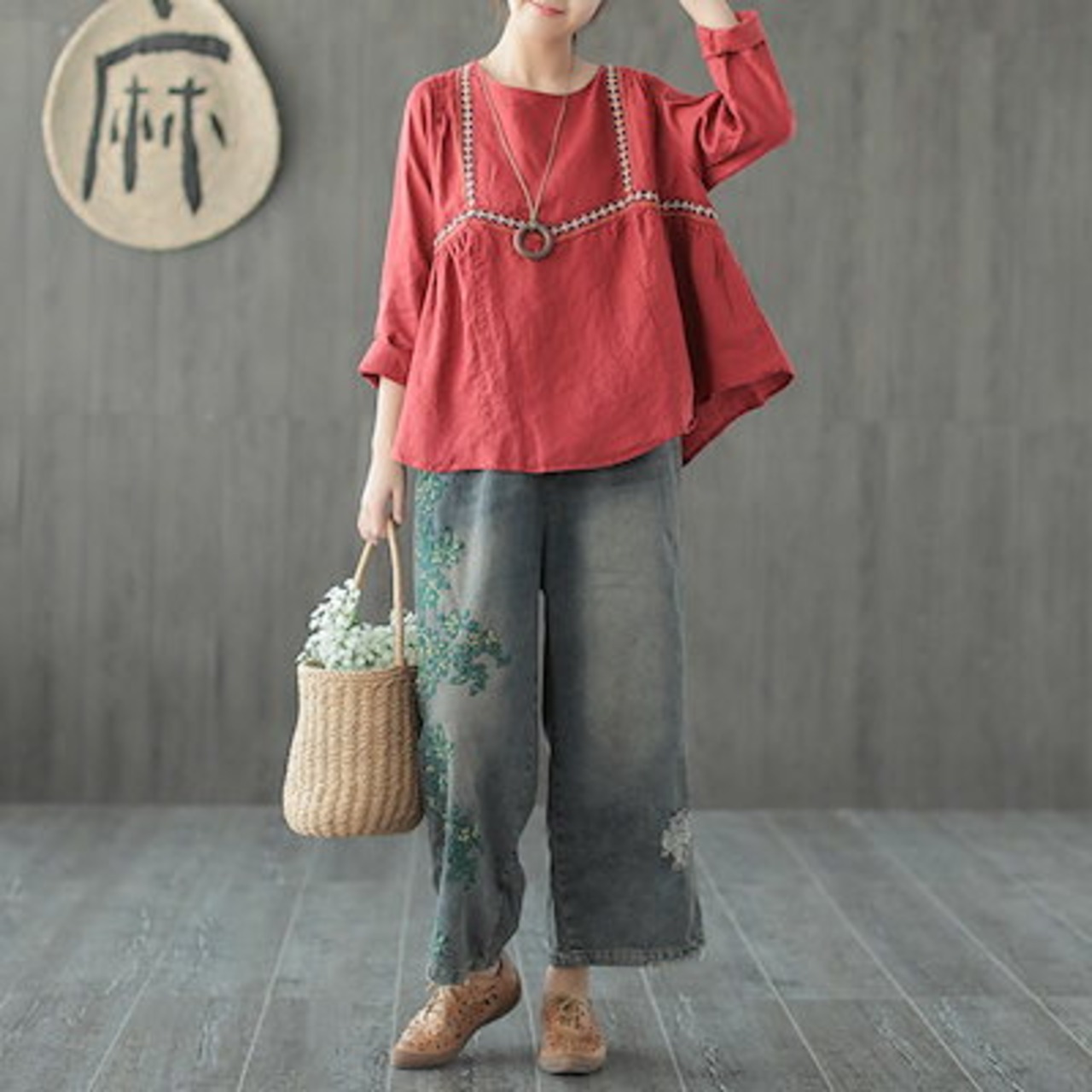 花柄刺繍 サルエルパンツ デニムパンツ ワイドパンツ バギーパンツ ガウチョパンツ レディース ウエ