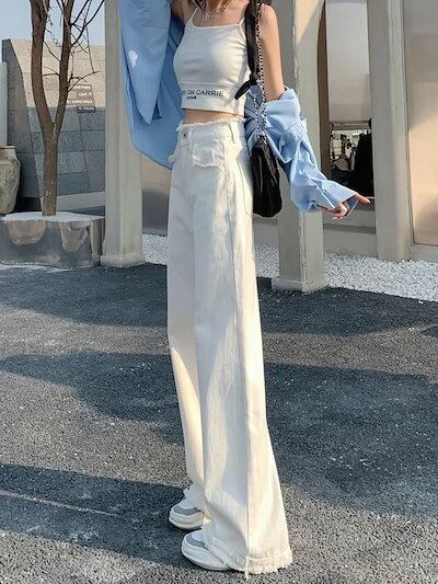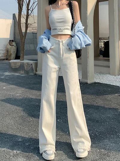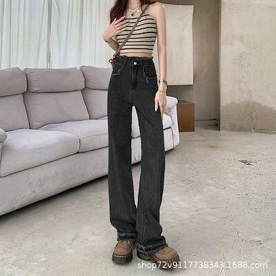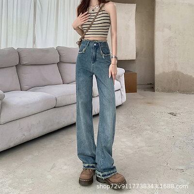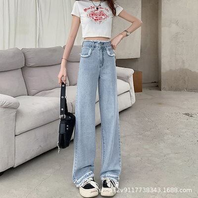 着痩せ レディース 切りっぱなし ゆったり デニムボトムス ストレートパンツ ワイドパンツ ハイウェスト モップパンツ