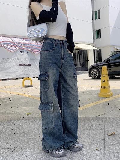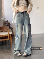 レディース ジョガーパンツ カーゴパンツ デニムボトムス 着痩せ ゆったり ワイドパンツ ポケット モップパンツ ハイウェスト