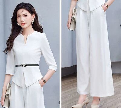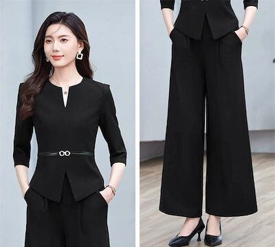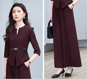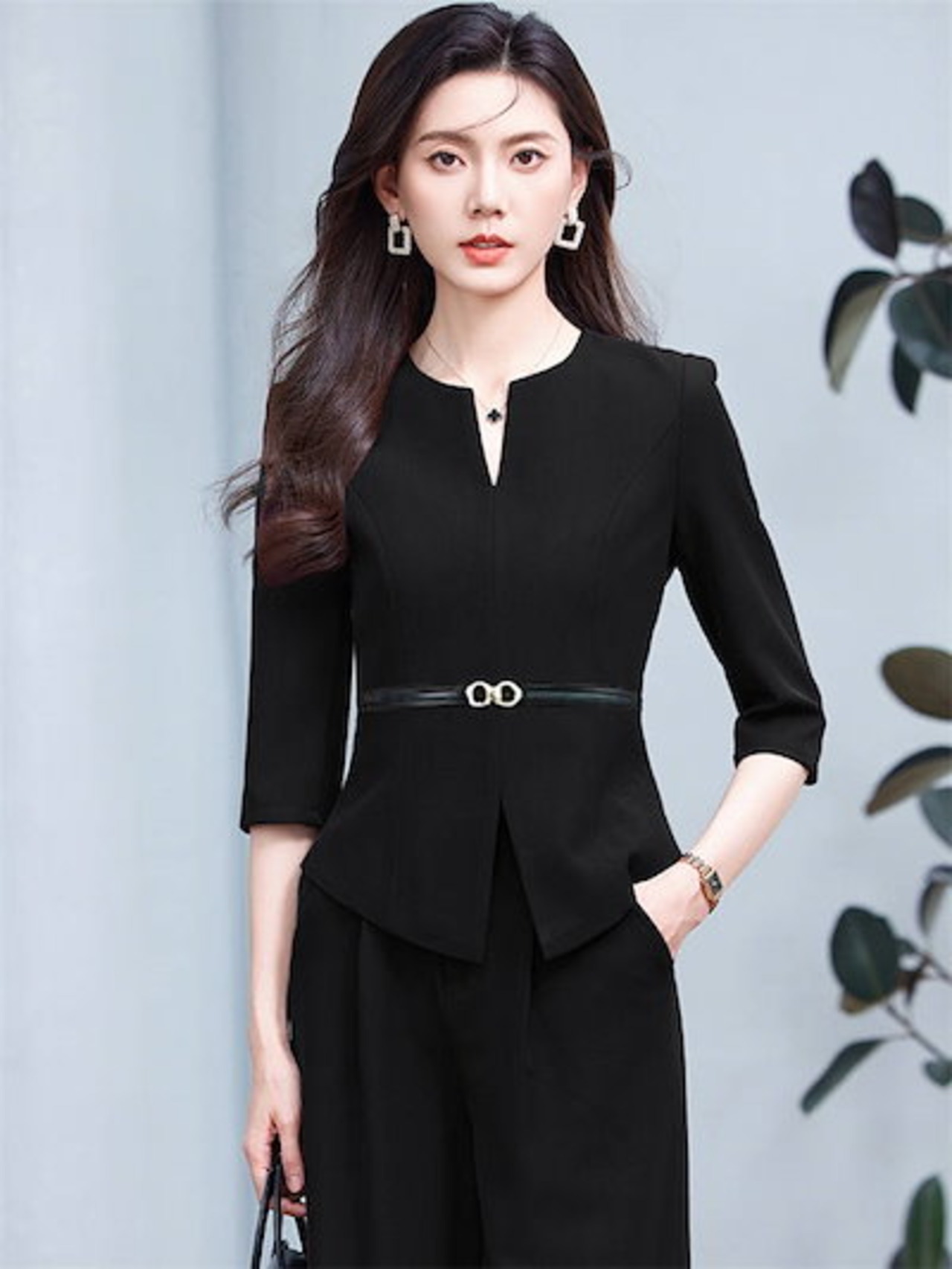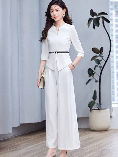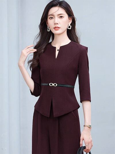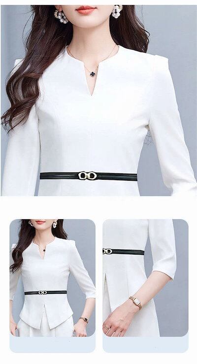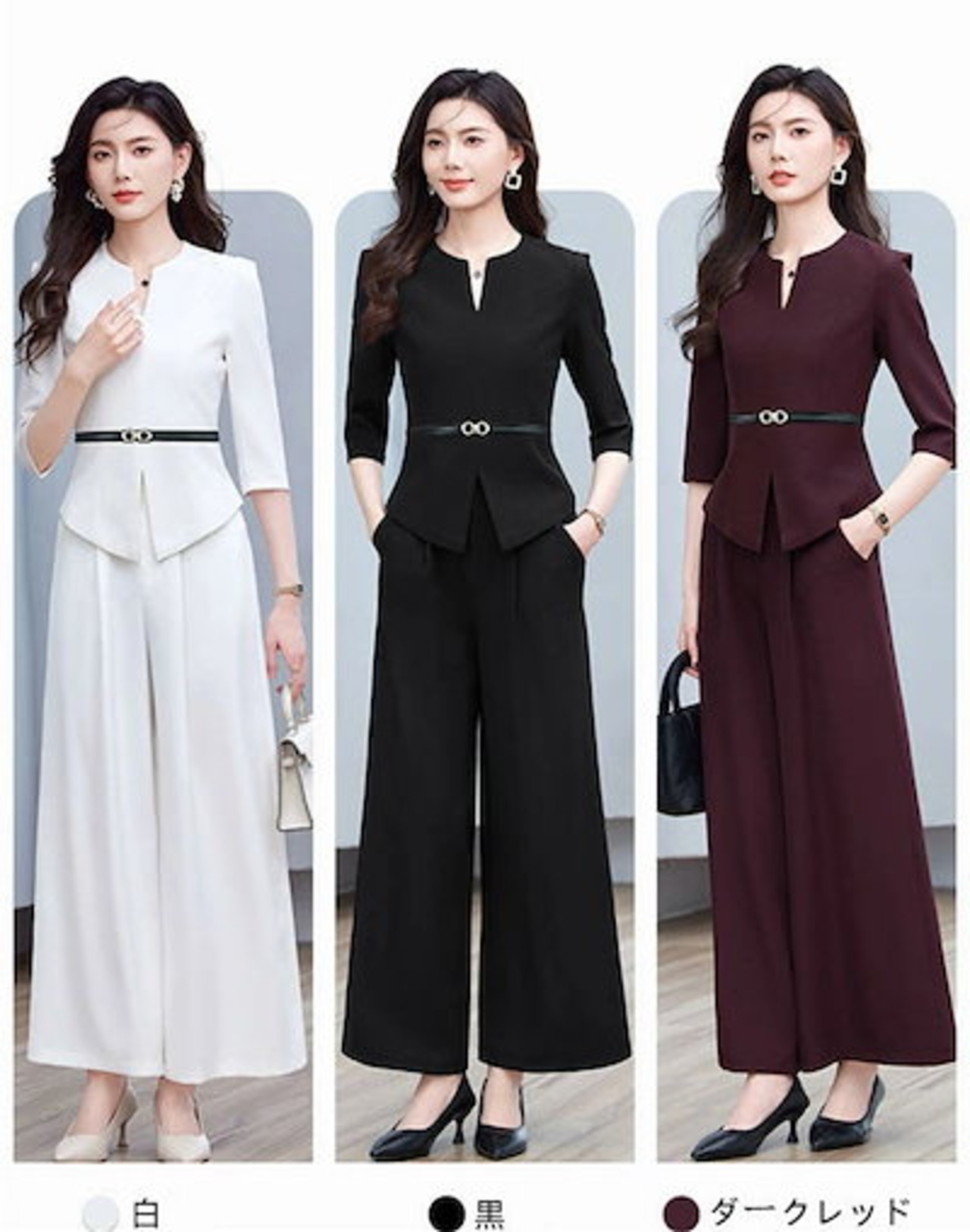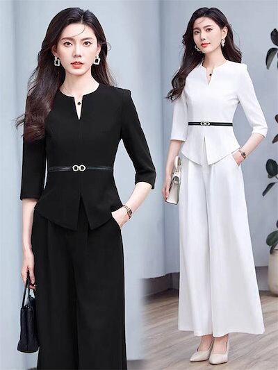 【ブラウス+パンツ】 スーツ レディース セットアップ スリットネック 洗える OL 2点セット パンツスーツ 7分袖 ロング丈 ビジネス リクルート 春 夏 秋 大きいサイズ 上品 入学式 ワイドパ