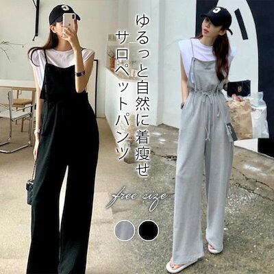 サロペット パンツ オールインワン レディース 春 秋 リブ ワイドパンツ ゆったり 体型カバー 女性 お呼ばれ 可愛い ワイドシルエット 大きいサイズ シンプル おしゃれ ゆったり カジュアル ナチ