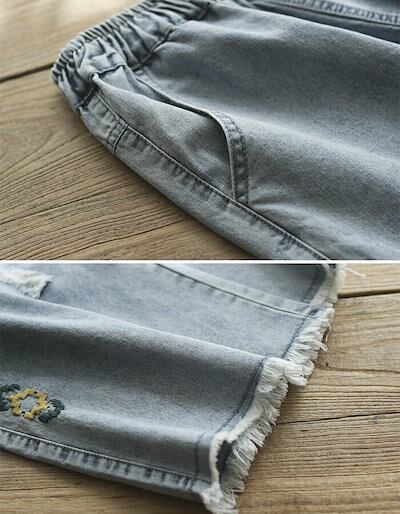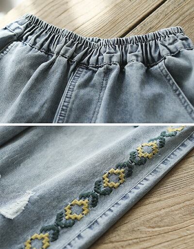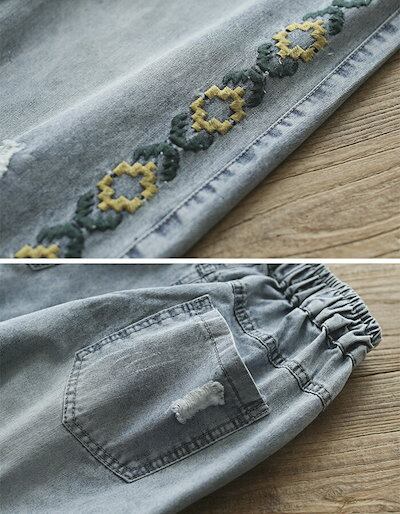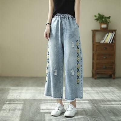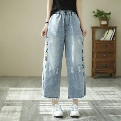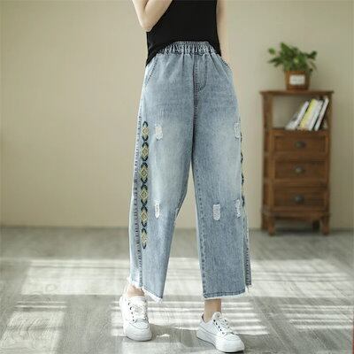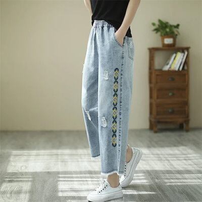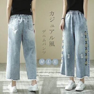 ワイドパンツ ガウチョパンツ パンツ レディース デニムパンツ デニム パンツ 春 夏 刺繍 刺繍花柄 刺繍パンツ ロングパンツ 九分丈 春ハイウエスト ボトムス ポケット付き 体型カバー カジュアル