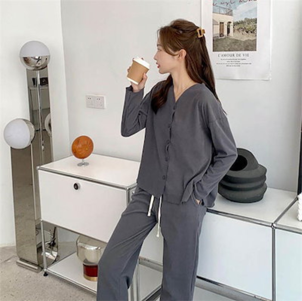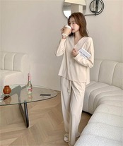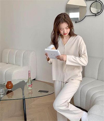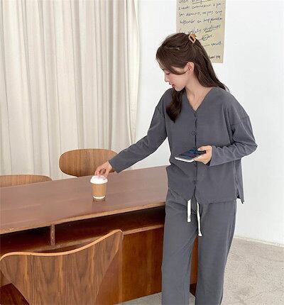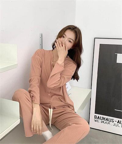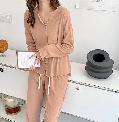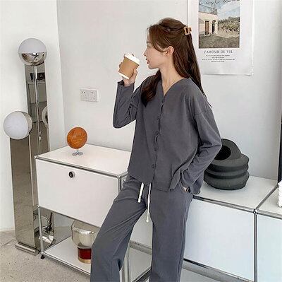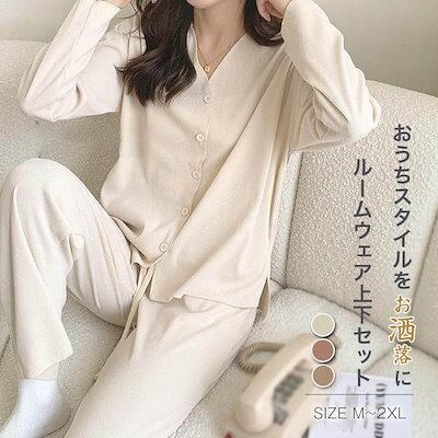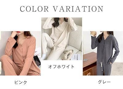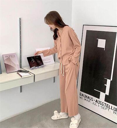 パジャマ レディース 長袖 前開き 秋 春 冬 ルームウェア セットアップ パンツ 部屋着 上下セット 2点セット vネック ロングパンツ ワイドパンツ 大人 寝巻き ナイトウェア ゆったり 秋冬 ウ