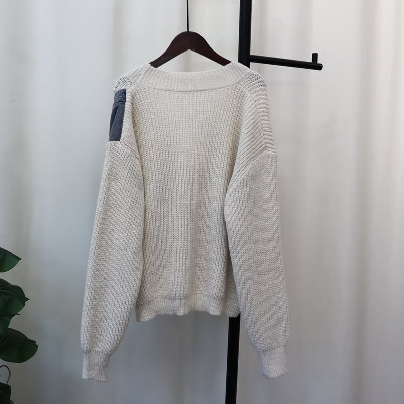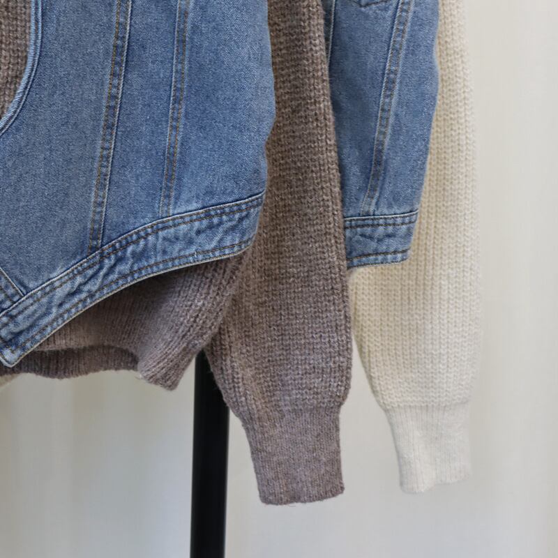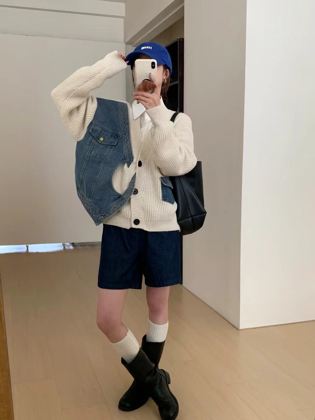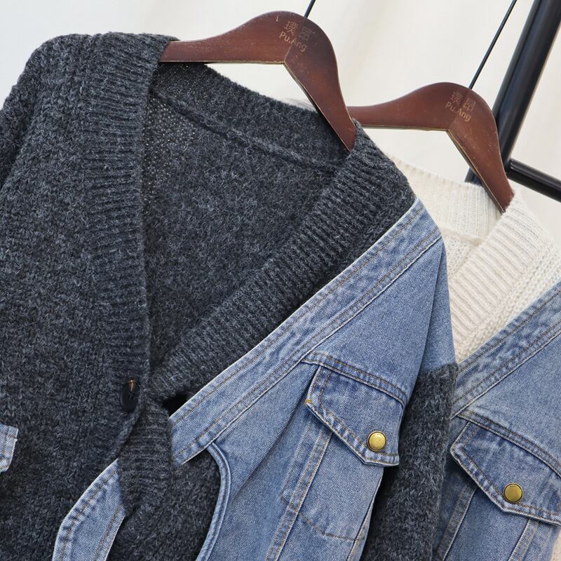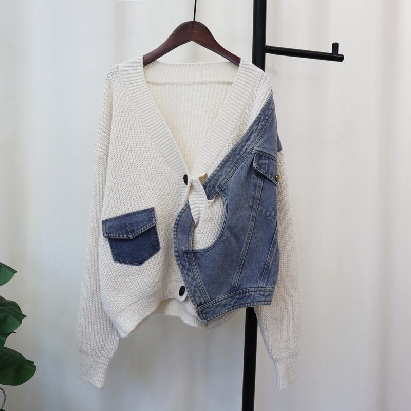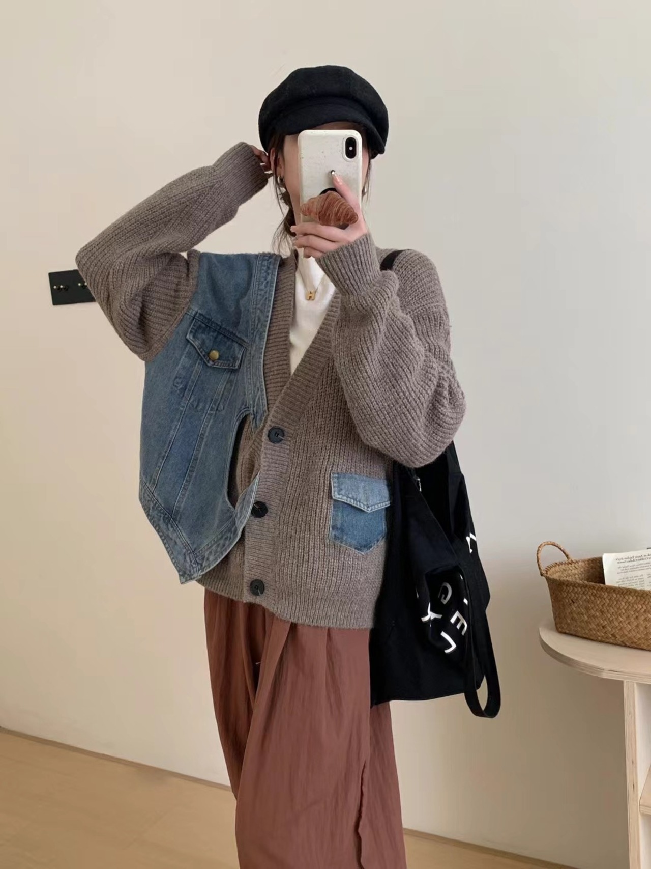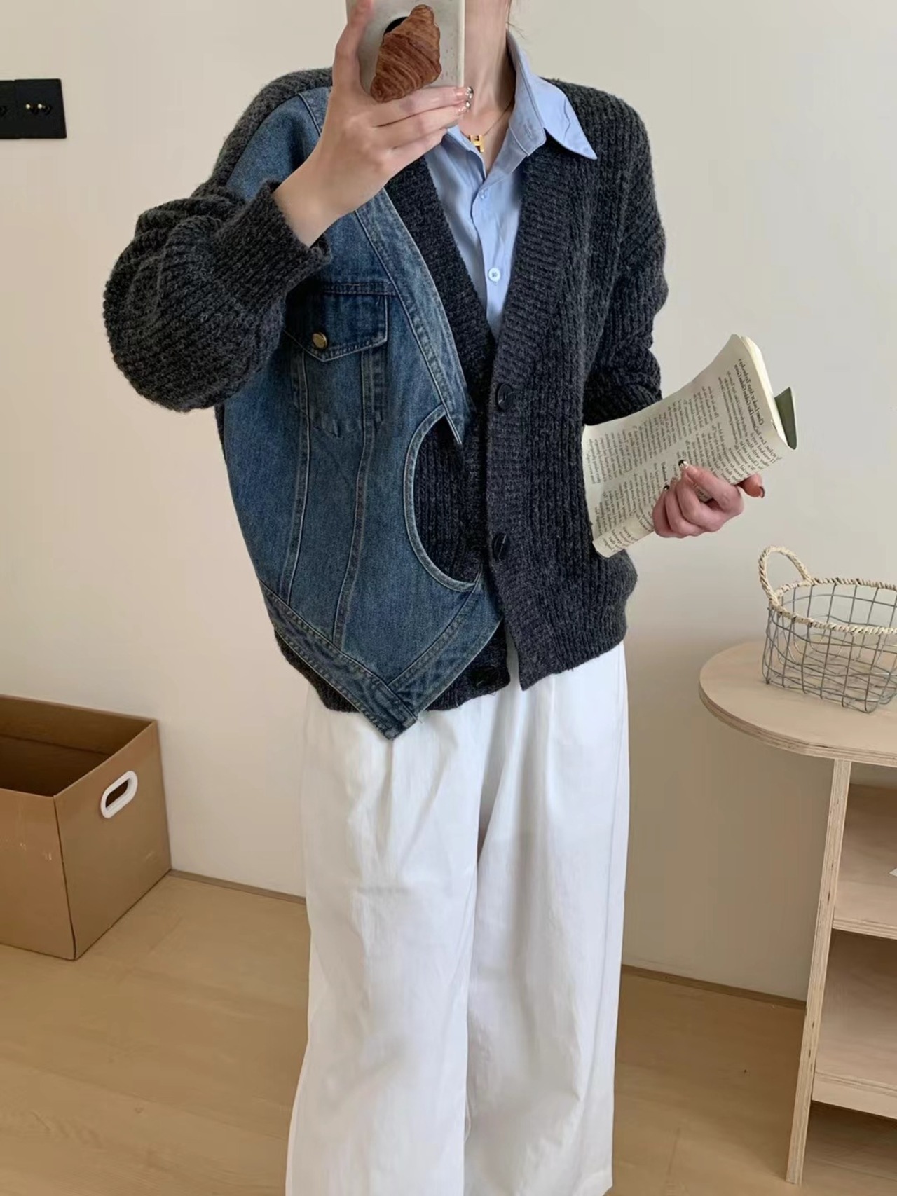 韓国ファッションオシャレ不規則切替デニムニットカーディガン レディース新作