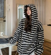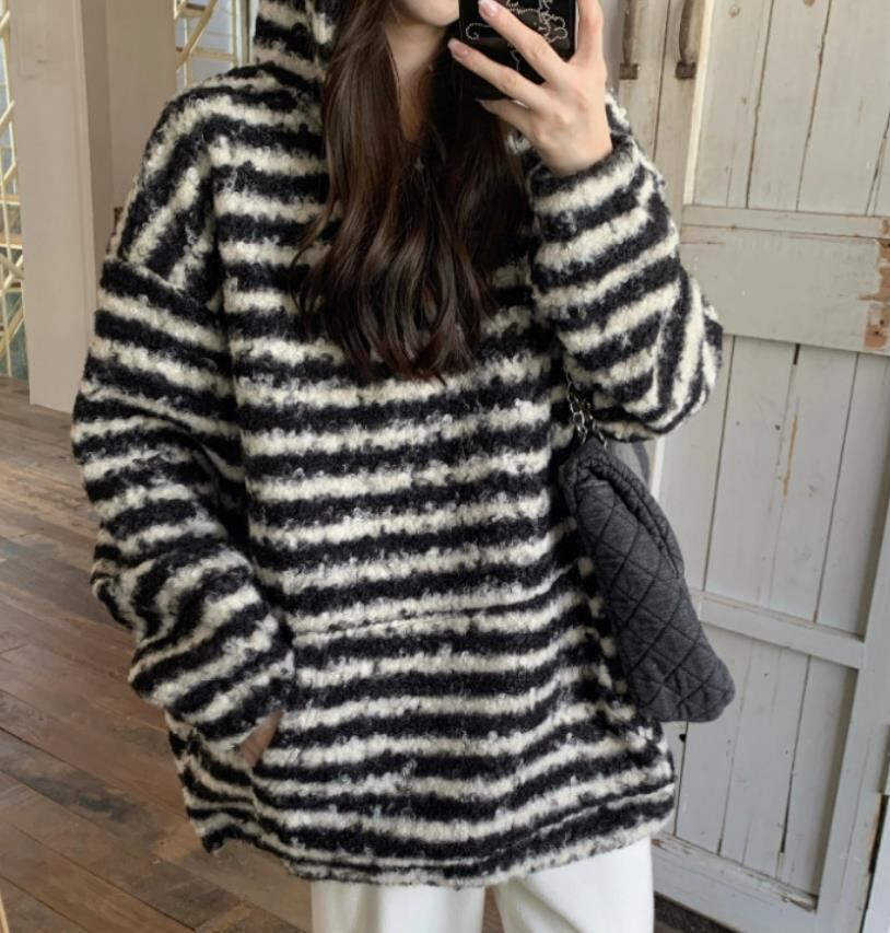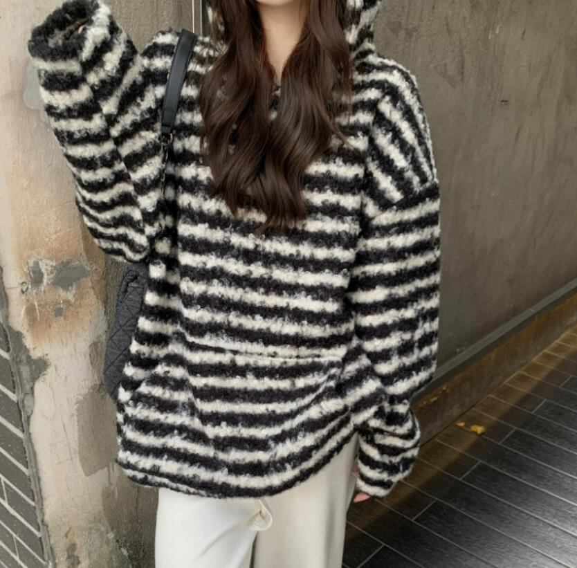 2025秋冬新作 トップス 女 レディース 長袖 帽子付け ボーダー柄 スウェット アウター コート