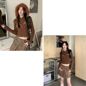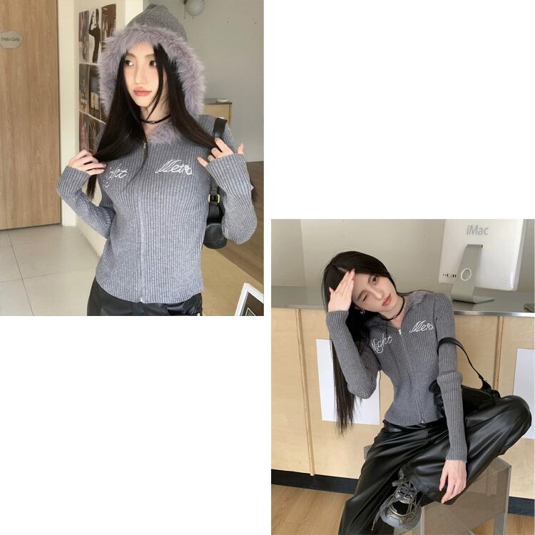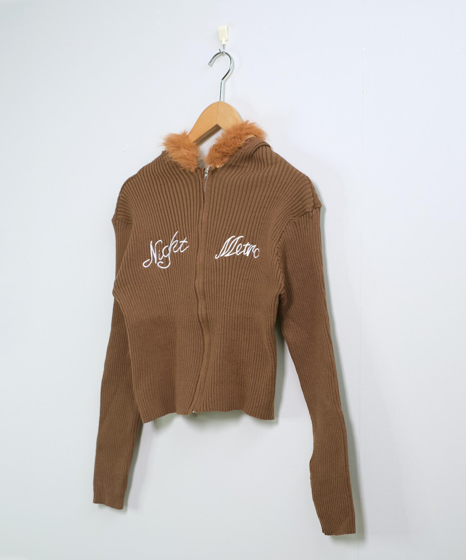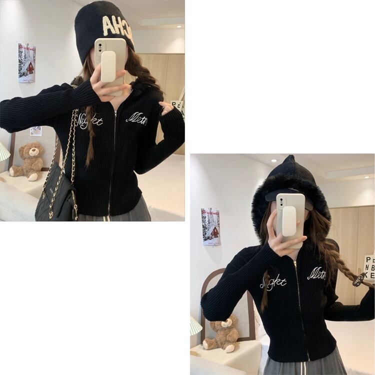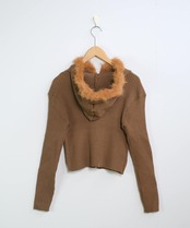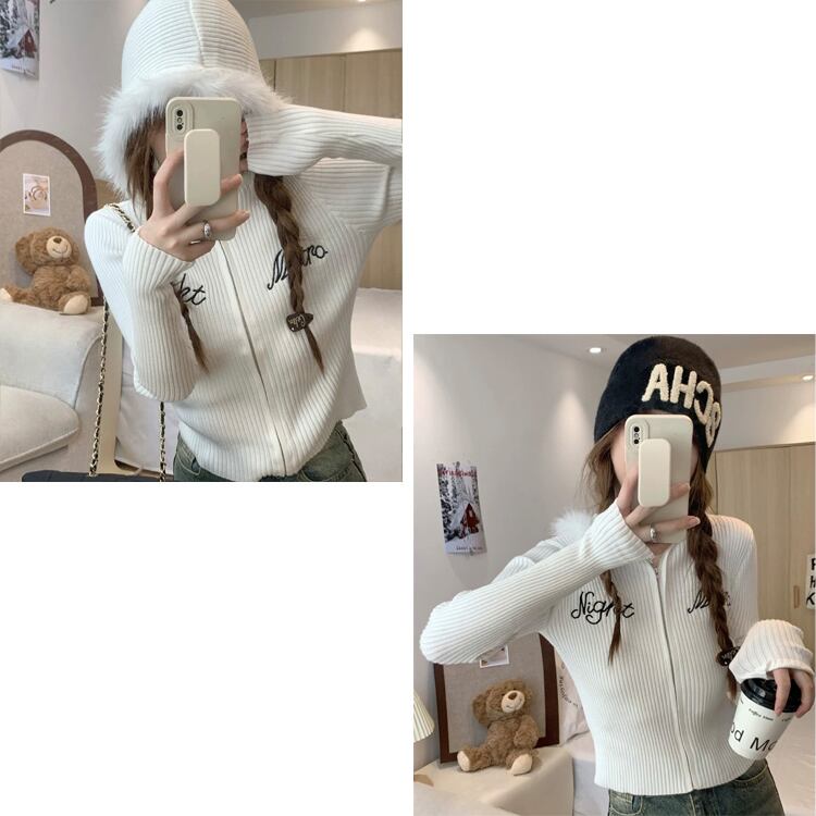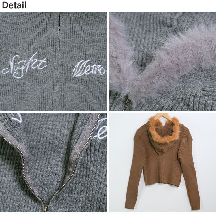 ファーフード ショート丈 ジップアップニットパーカー【即納】レディース 韓国 プチプラ おしゃれ