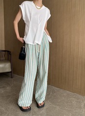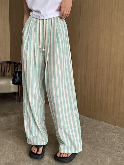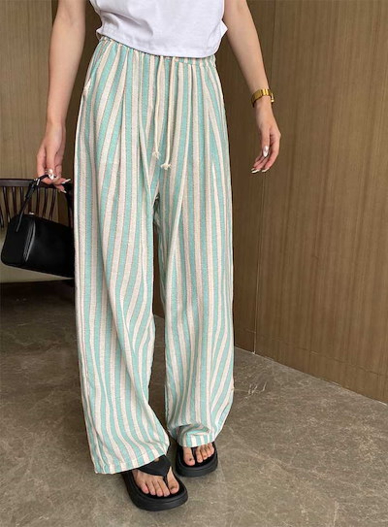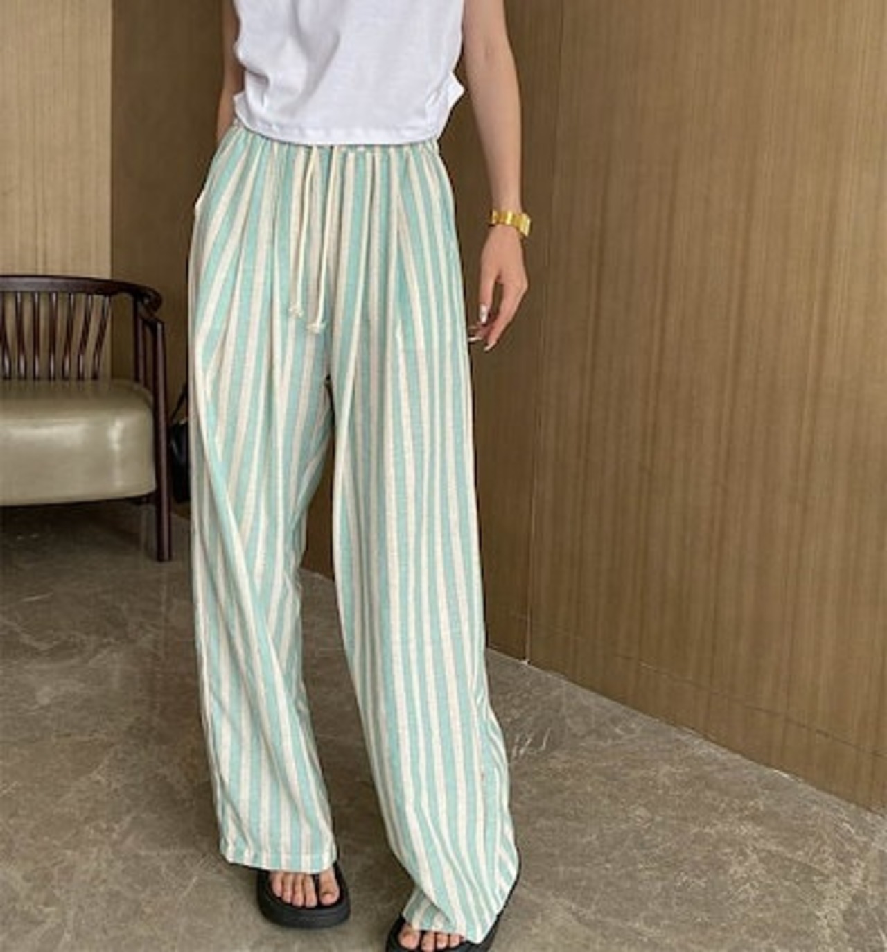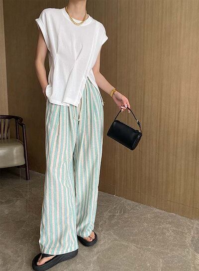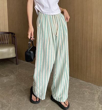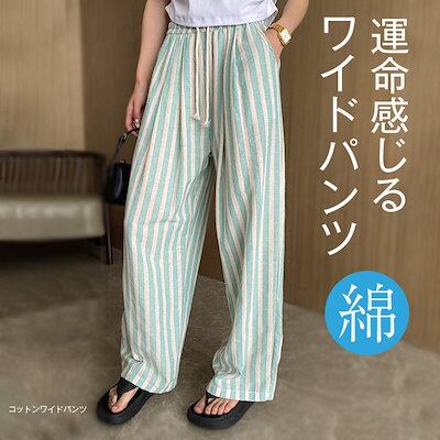 ワイドパンツ ストライプパンツ レディース パンツ ボトムス ロング ストライプ柄 ゆったり イージーパンツ ガウチョパンツ ウエストゴム 大きめ 大きいサイズ 総柄 涼しい 楽ちん 体型カバー