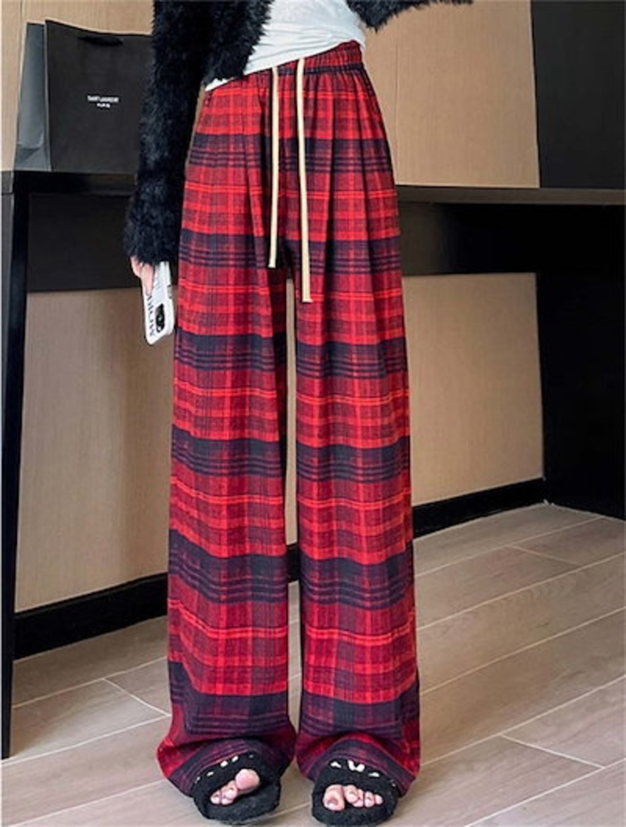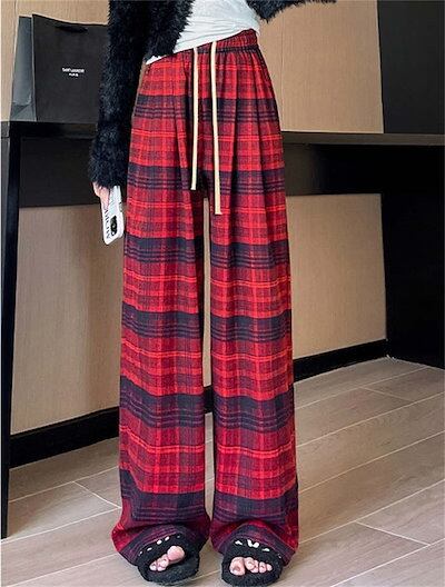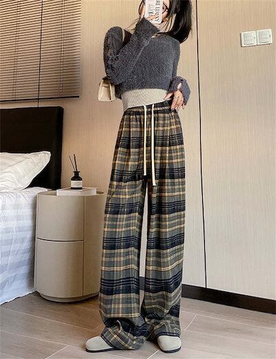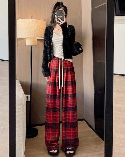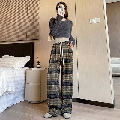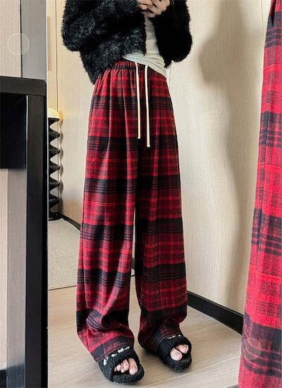 チェックパンツ レディース 秋冬 ワイドパンツ ロングパンツ 春 秋 冬 ガウチョパンツ 裏起毛 2type ボトムス パンツ チェック柄 ワイド 大きいサイズ ストレート ウエストゴム ポケット ゆ