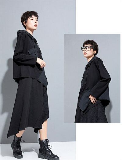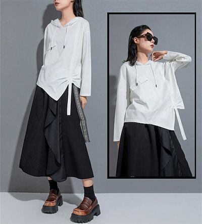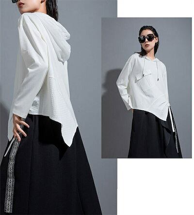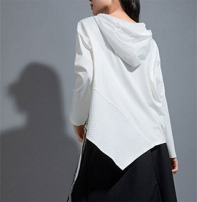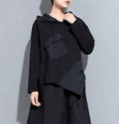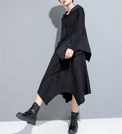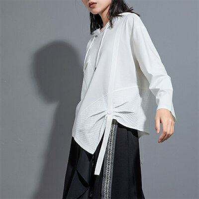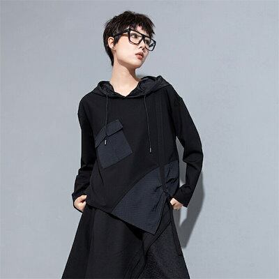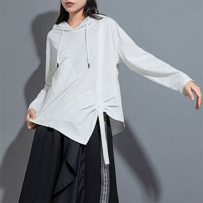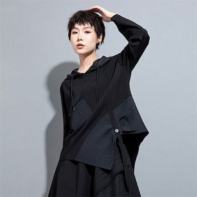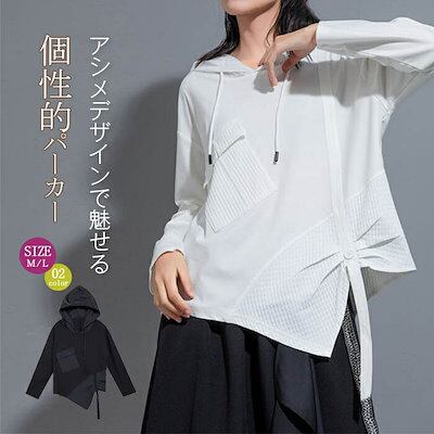 パーカー Tシャツ レディース 長袖 春 秋 カットソー トップス 無地 プルオーバー パーカー フード付き 異素材 アシンメトリー 変形 ゆったり モード系 ストリート 個性派 大人 ファッション