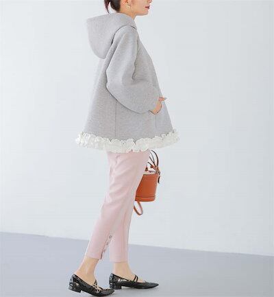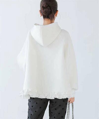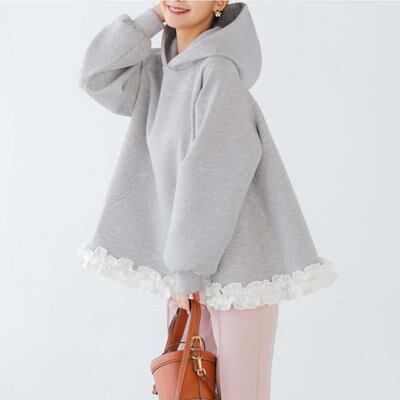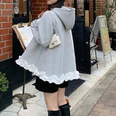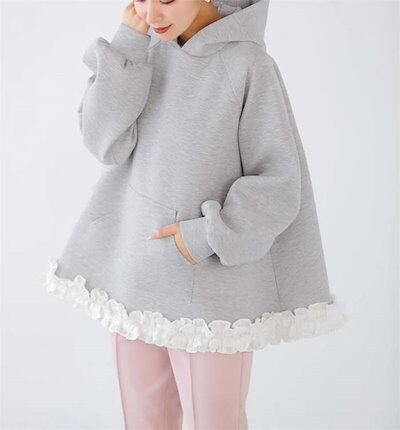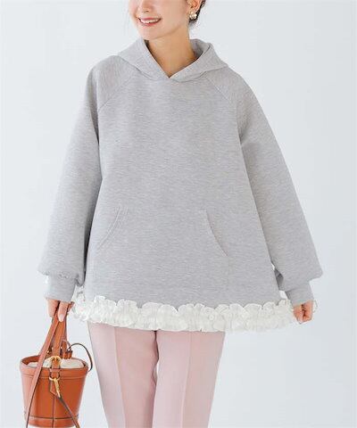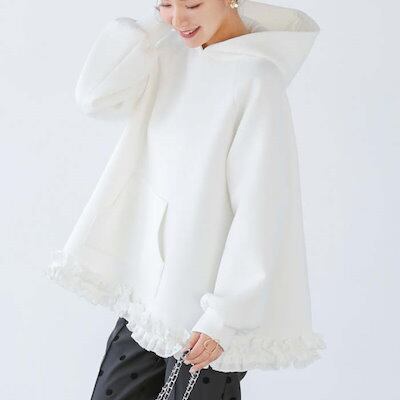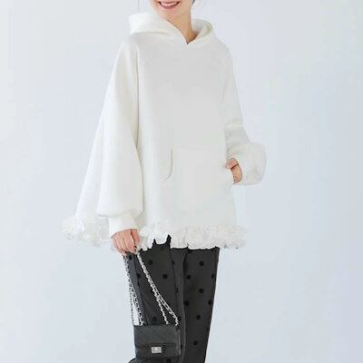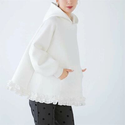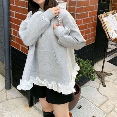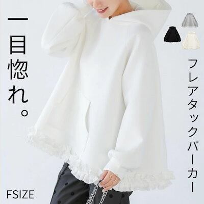 パーカー レディース レーナー スウェット 春 秋 冬 フリル トップス スエット フーディー 長袖 プルオーバー フレア チュニック アウター 体型カバー おしゃれ フード付き 無地 シンプル ポケ
