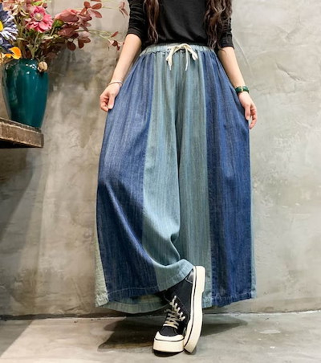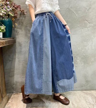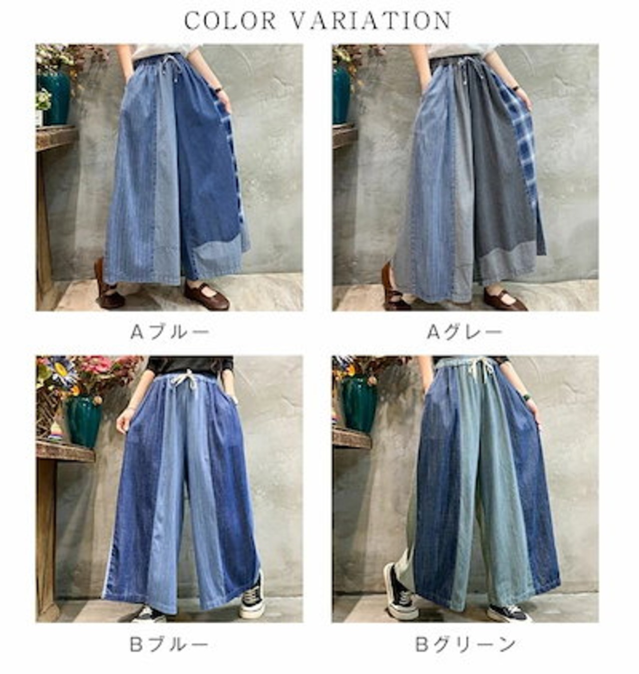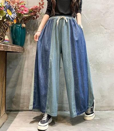 デニムワイドパンツ レディース デニムパンツ ワイドパンツ 切り替え 配色 ロングパンツ ウエストゴム ボトムス カジュアル 大きいサイズ 大人 楽ちん 美脚 ゆったり デニム 幅広い エレガント 体