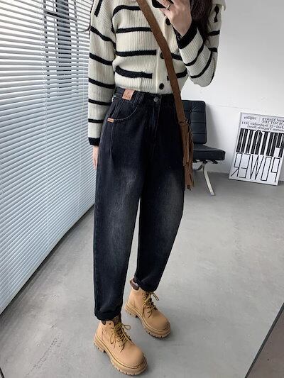 韓国ファッション デニムパンツ ギャザージーンズレディース秋冬新作ハイウエストビッグサイズで痩せ見えワイドパンツ