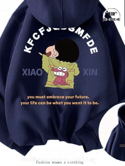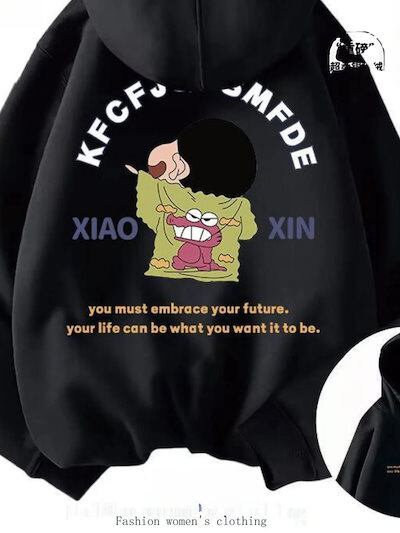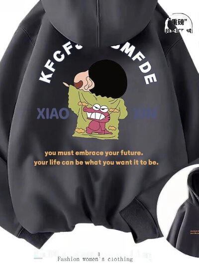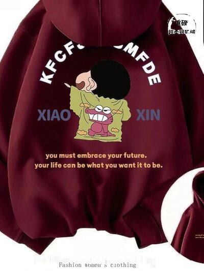 2025新品入荷激安男性と女性のためのクレヨンしんちゃんバーガンディスウェットシャツシーズンプラスベルベットルーズカップルジャケットフード付きスウェットシャツ