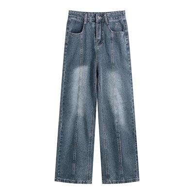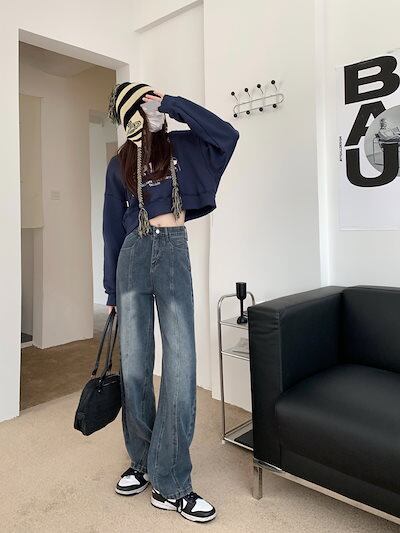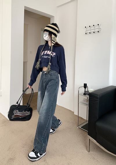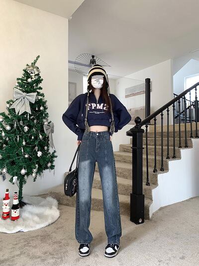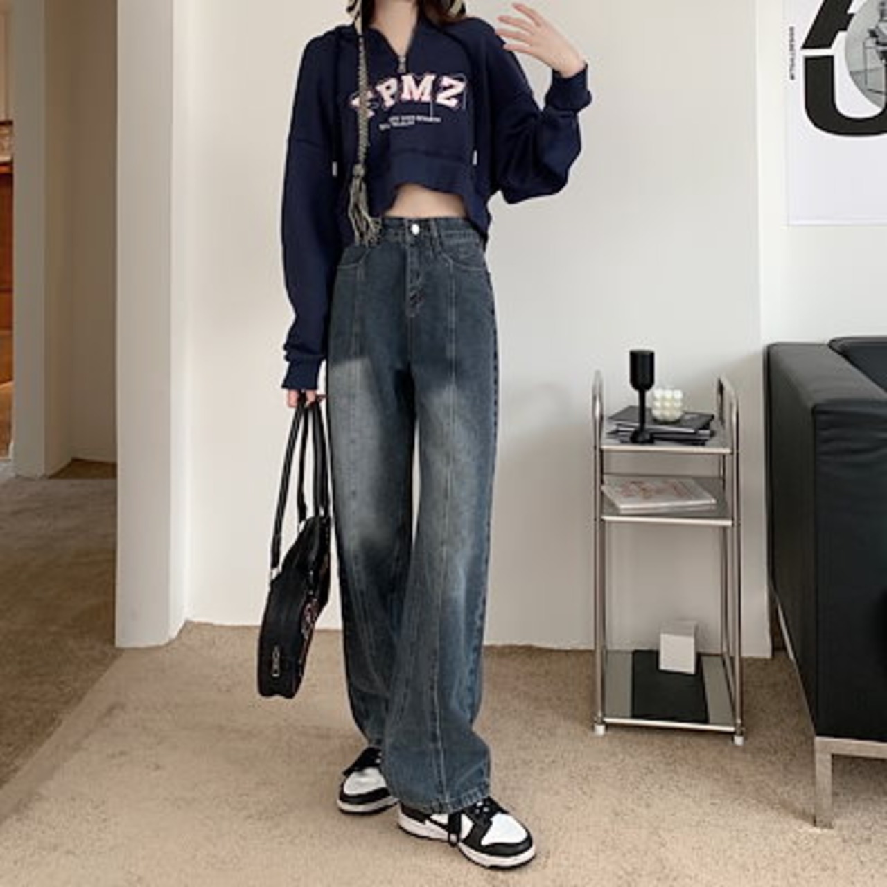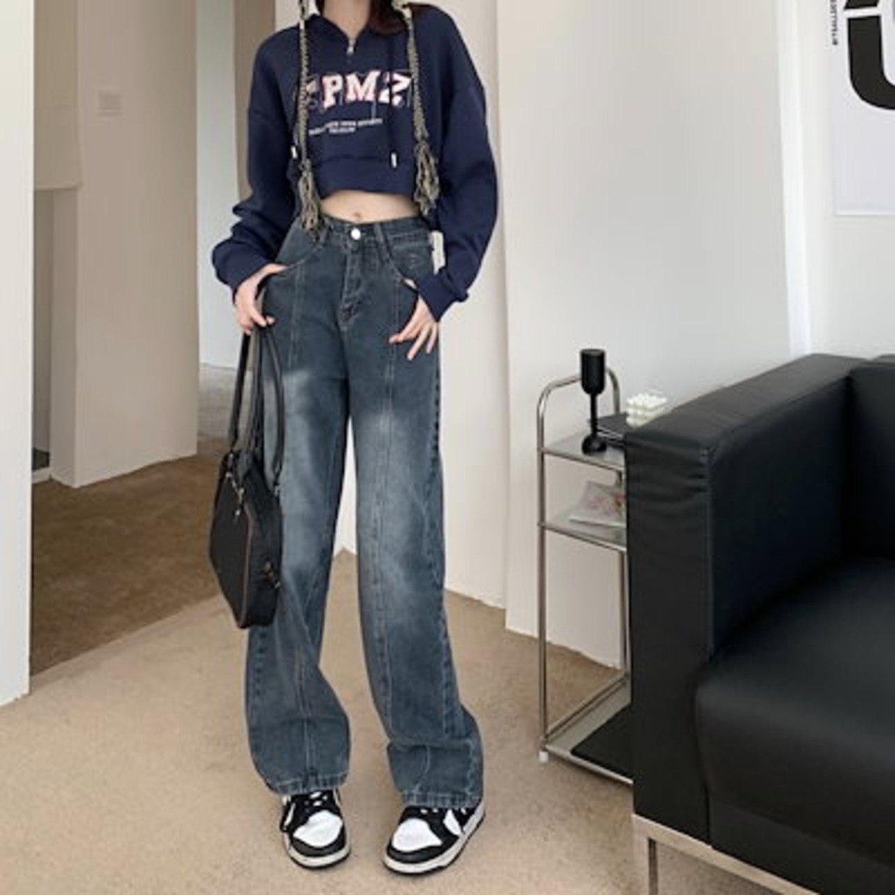 2024 春夏 パンツ デニム ジーンズ ロング丈 ストレート ジーンズ ゆったり ハイウエスト 脚長効果 レッグ美脚効果 細見え 秋 カジュアル ストリート 加工 韓国ファッション お出かけ