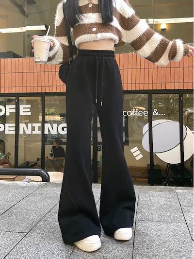 パンツ スウェット 厚手 ウエストゴム ロング丈 ワイドレッグ ハイウエスト 脚長効果 美脚効果 細見え 秋冬 シンプル カジュアル 韓国ファッション レディース お出かけ