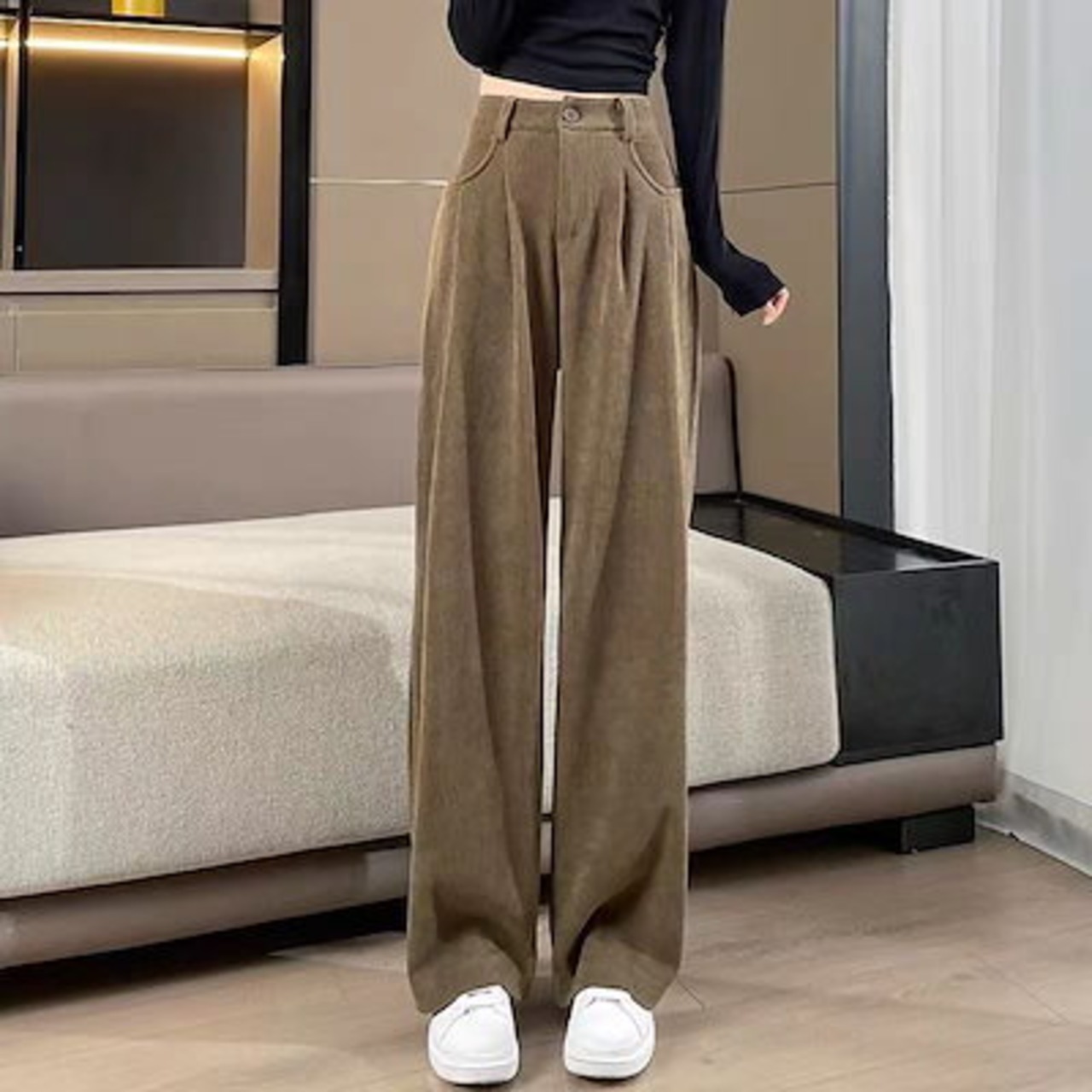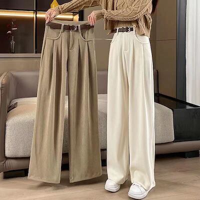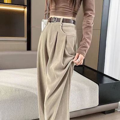 コーデュロイワイドパンツを厚めにしたレディースカジュアル新型秋冬ストレートパンツハイウエストでゆったりと着やせ